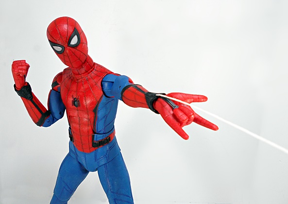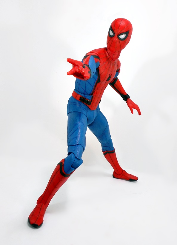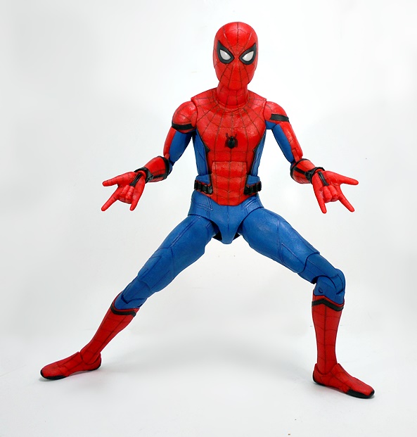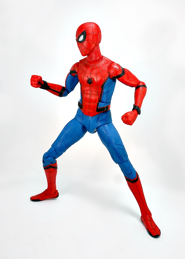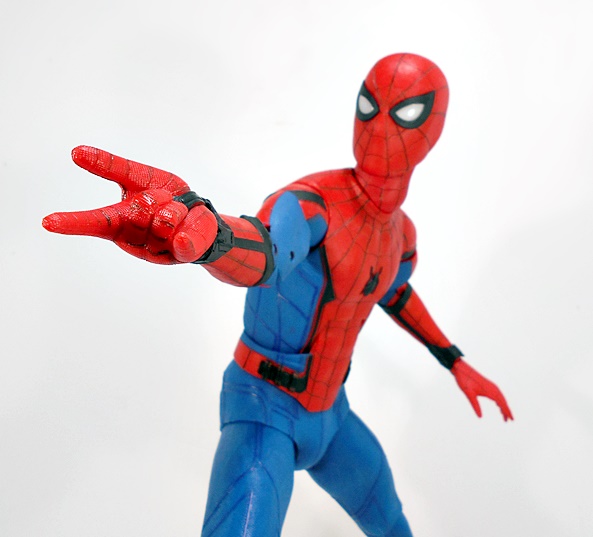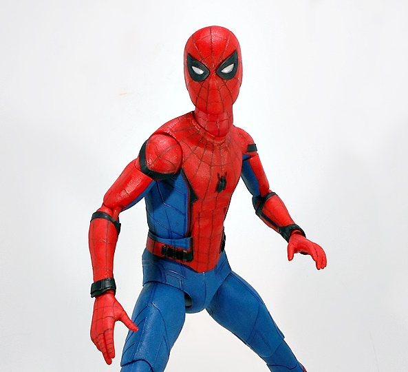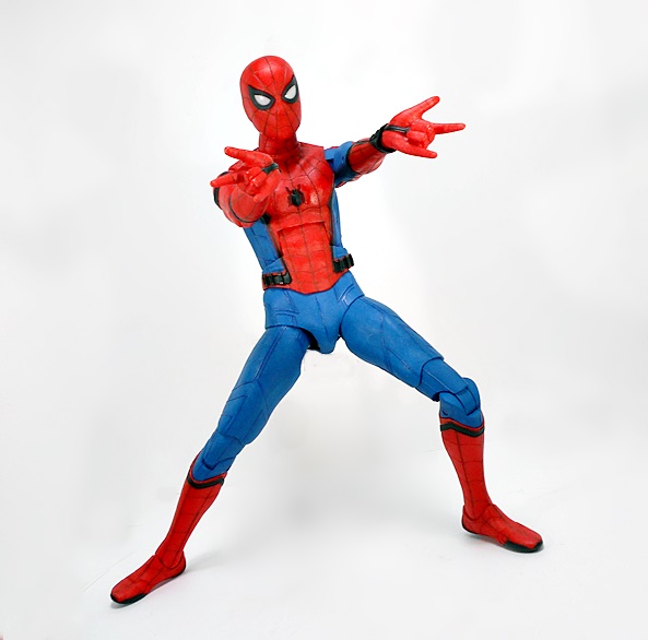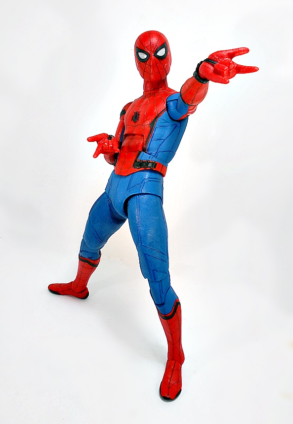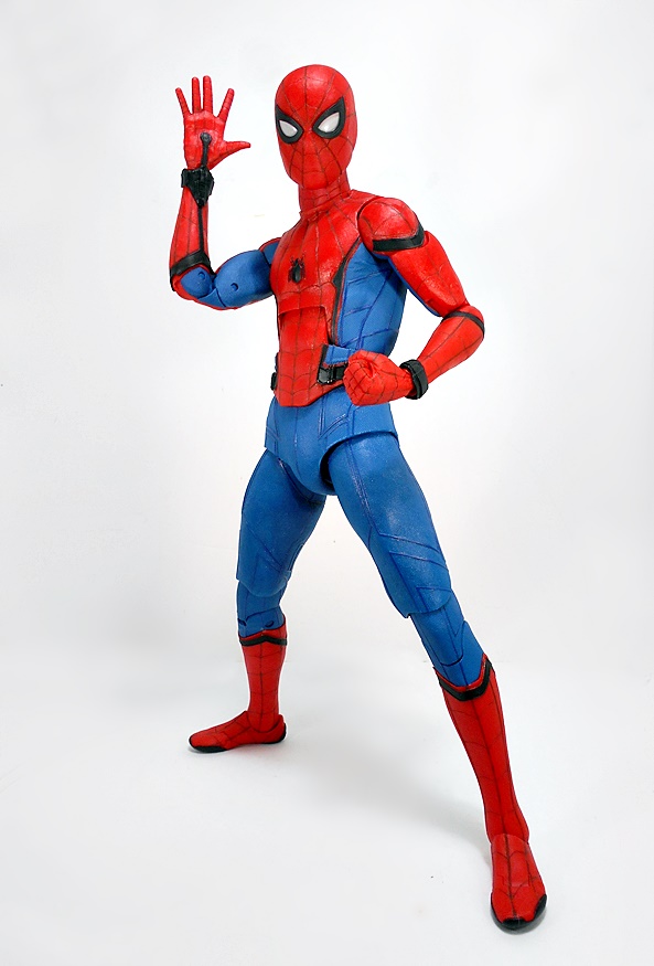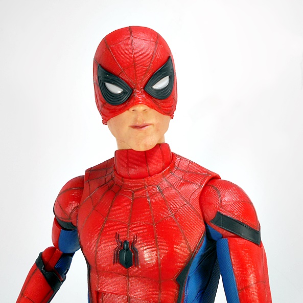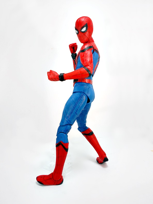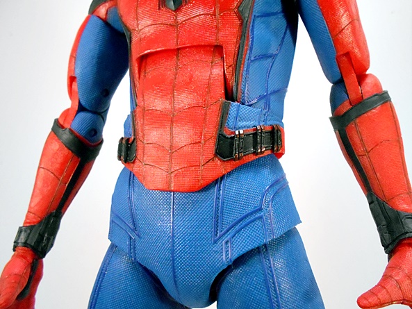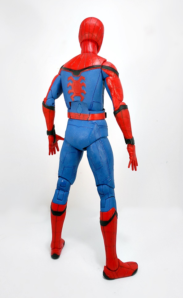 It’s safe to say that I was a big fan of Homecoming, but even more so I absolutely loved the design of this suit. It manages to look fresh and new while still evoking a sense of the classic Spider-Man I know and love. Every bit of the figure’s surface is covered with a basketball-like texture, you get some raised panel lines in the blue sections, and the red sections have the sculpted and painted web pattern running throughout. The black bands on the tops of the boots and the shoulders are sculpted, as are the black frames on his forearms that support his web shooters. I also absolutely love the detail in the black strips on his waist where he stores his extra cartridges of web fluid. The tiny sculpted spidey logo on his chest is the only thing I’m cool on when it comes to this design. I wish that was a bit bigger, but that’s not the figure’s fault. Happily, he does have a much bigger emblem on his back, which looks great in red against the blue background..