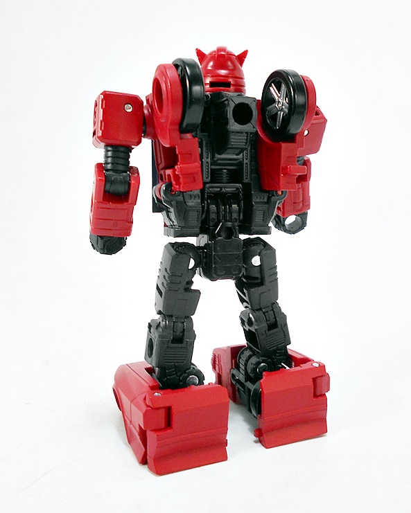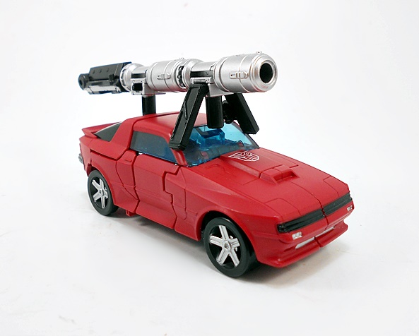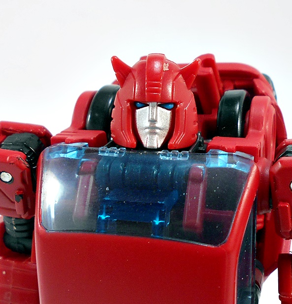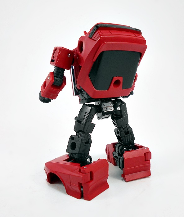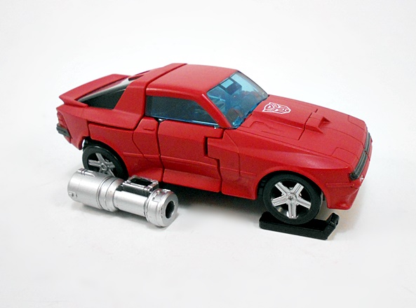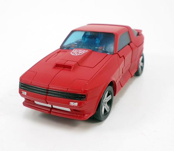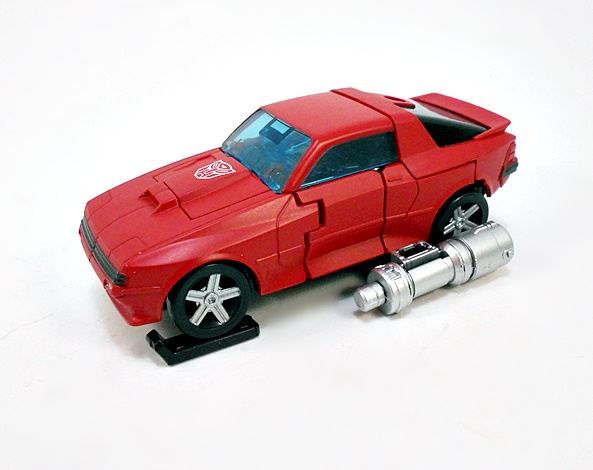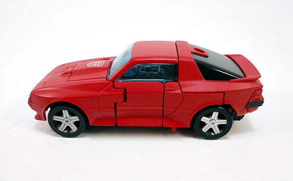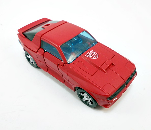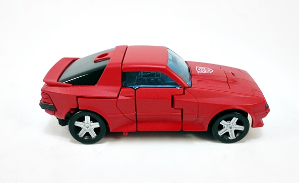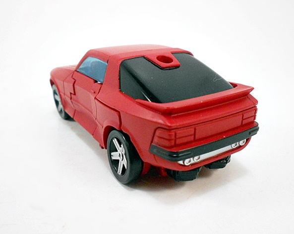 Size notwithstanding, I think this is a fine little alt mode. The red plastic looks great and there are some additional silver and black paint operations for the front and back. The wheels are also painted silver, the rear window is painted black, and the windshield and side windows are cast in translucent blue plastic. I’m not really a fan of different color windows, but whatever. An Autobot insignia stamped on the hood ties the whole thing together. Despite the usual seams, the car holds together pretty well and it feels solid.