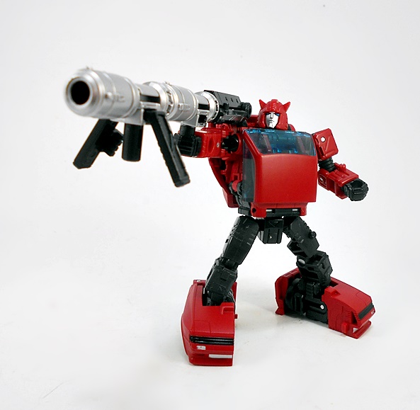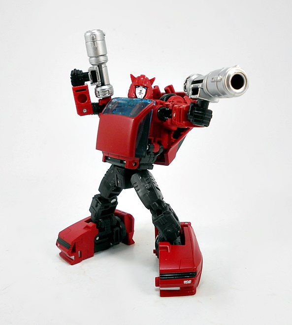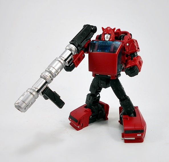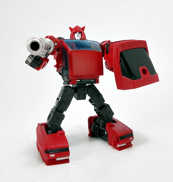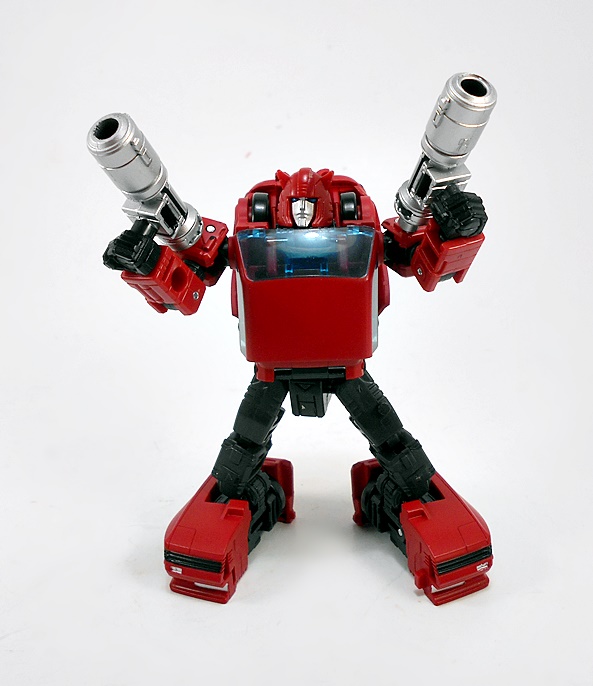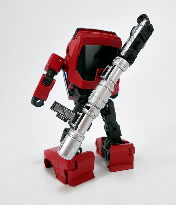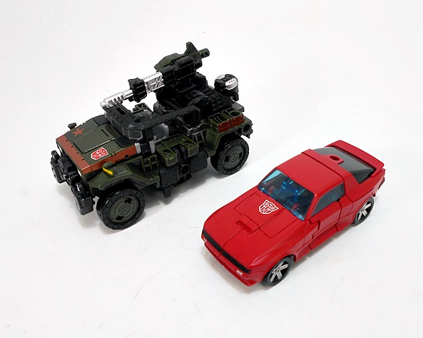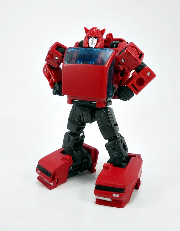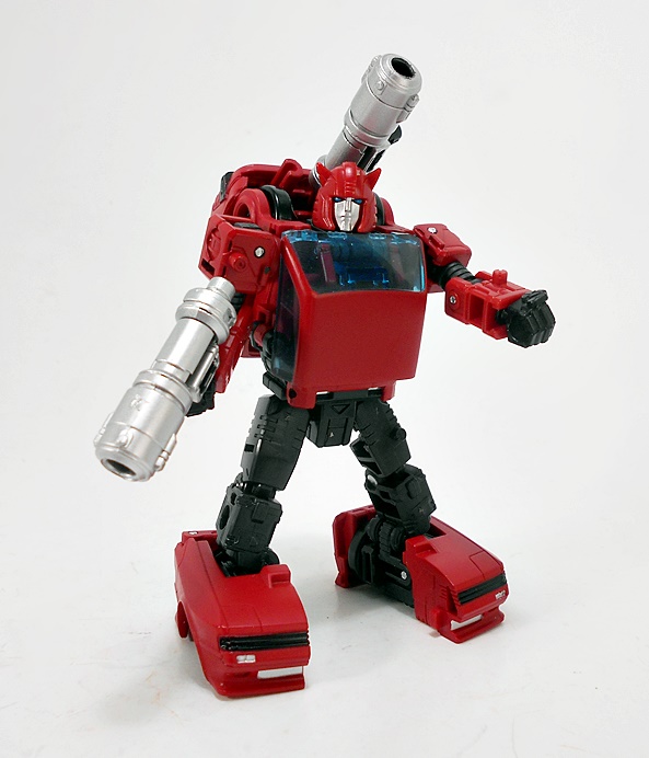 Size notwithstanding, I think this is a fine little alt mode. The red plastic looks great and there are some additional silver and black paint operations for the front and back. The wheels are also painted silver, the rear window is painted black, and the windshield and side windows are cast in translucent blue plastic. I’m not really a fan of different color windows, but whatever. An Autobot insignia stamped on the hood ties the whole thing together. Despite the usual seams, the car holds together pretty well and it feels solid.