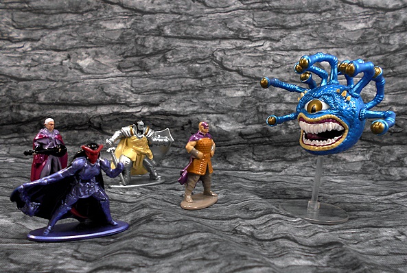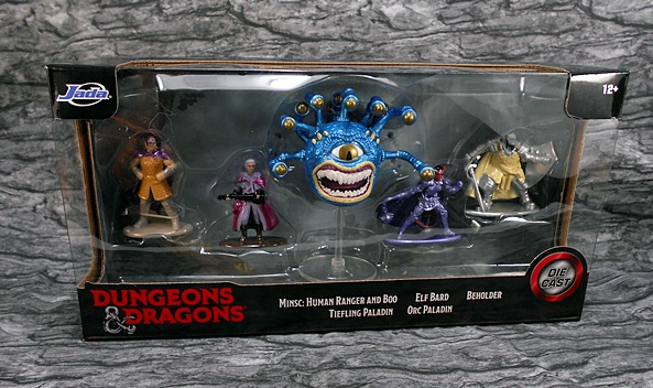 As far as I know, Jada is known for their diecast cars and miniature figures, so the D&D license seems like a no-brainer. And we all know Hasbro wasn’t doing a god damn thing with the license, right? This set of five painted miniatures comes in a window box, which pretty much lets the miniatures do all the talking. The D&D logo is downplayed, the bottom denotes who you’re getting, and the back has a pretty cool fantasy painting. The set gives you all you need to set up a little battle between your party of four adventurers and a vile beholder. Let’s open it up and have a look.