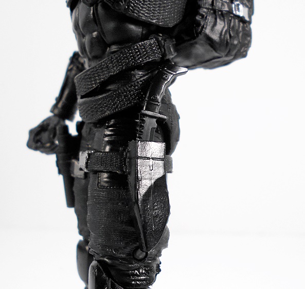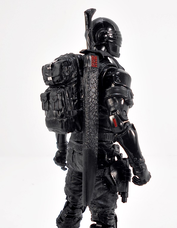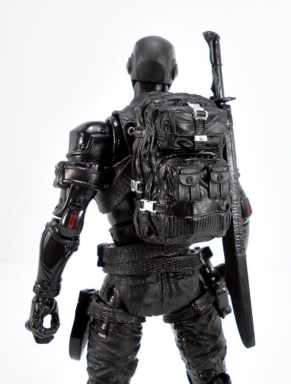 Snake Eyes has a hole in his back and through the shoulder strap that can be used for a few accessories, but primarily his backpack. It’s cast in matte black plastic and like the figure it’s loaded with detail. It also features some silver paint operations on the buckles and snaps. Unlike Duke’s backpack, this one stays on extremely well. It also has a peg hole on the side so you can attach the sword scabbard.