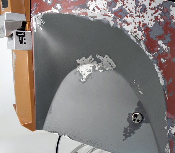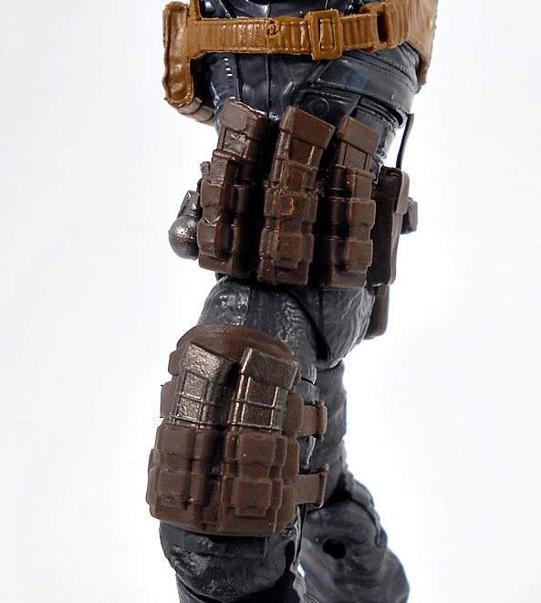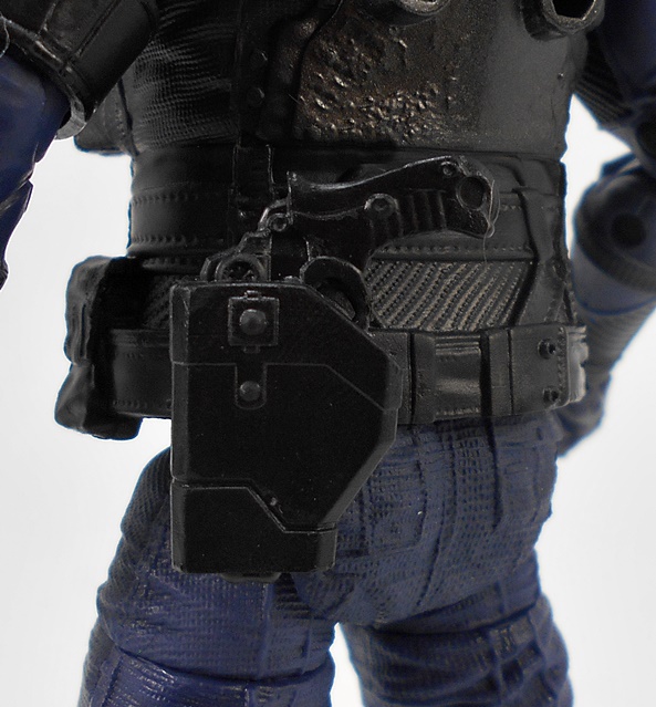 Yelena is wearing a belt, sculpted as a separate piece, with a silver belt buckle, donning the Black Widow emblem. The belt includes a holster, which is secured to her right thigh with two straps, and a brace of combat knives secured to her left thigh with a single strap. The holster works to hold one of her two pistols, but the knives are merely sculpted into place and not removable.