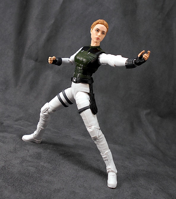 Let me start by saying that from a design standpoint, this is not a terribly exciting figure, but that’s not in any way Hasbro’s fault. They did the best with what the design that was given them. Yelena is wearing what appears to be a close copy of Black Widow’s white arctic suit, which we saw released as a Deluxe Legends figure a little while back. She even has the Widow’s Bite bracelets on her wrists. The biggest difference here is the green tactical vest that’s sculpted as part of the figure. And if I recall correctly we even see Natasha wearing something similar in part of the trailer. It has some cross straps with painted silver buckles, and some black accents as well. Like I said, there’s nothing terribly flashy here, but it’s still pretty well done.