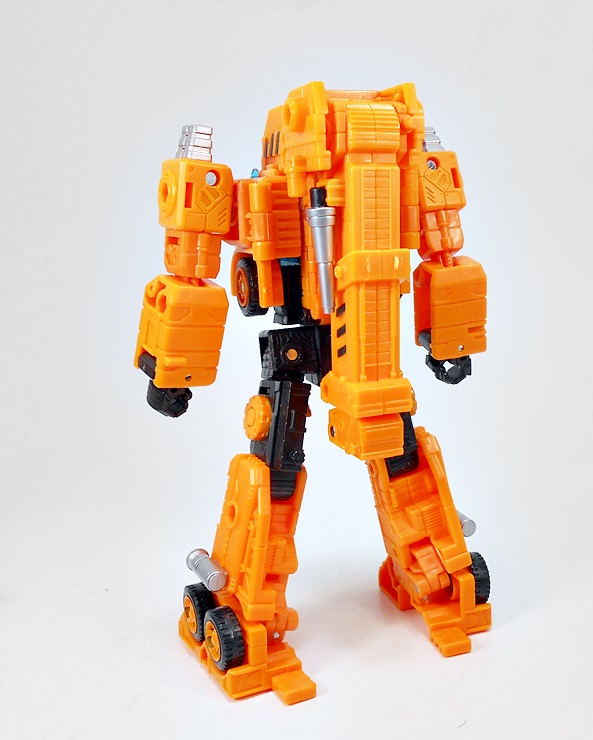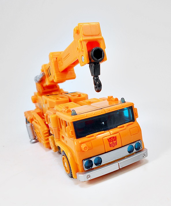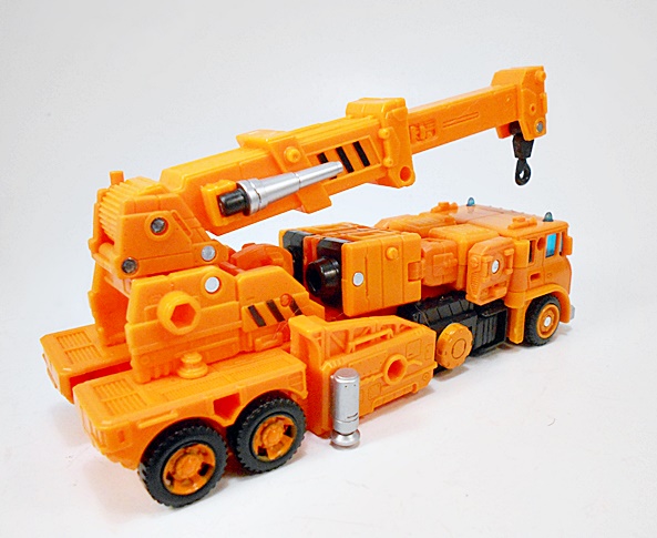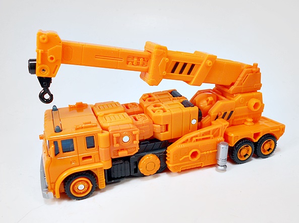 As always, Grapple is an orange construction crane, and not a bad looking one at that. Sure, anyone with even a cursory knowledge of convertorobots will be able to see most of what’s going on here. He wears his arms on the vehicle’s back and you can even see his head tucked in at the base of the crane, but turned around and pretending that you don’t notice it! Of course, none of these things bother me, as I’d much rather deal with some obviousness than unnecessary panels that complicate the transformation and wind up as unwanted kibble on the robot mode. I mean, come on, I bought this, I know what it is, it ain’t fooling me! There is some nice detail scattered here and there like sparing panel lines, and the non-functioning stabilizers on the sides painted silver.