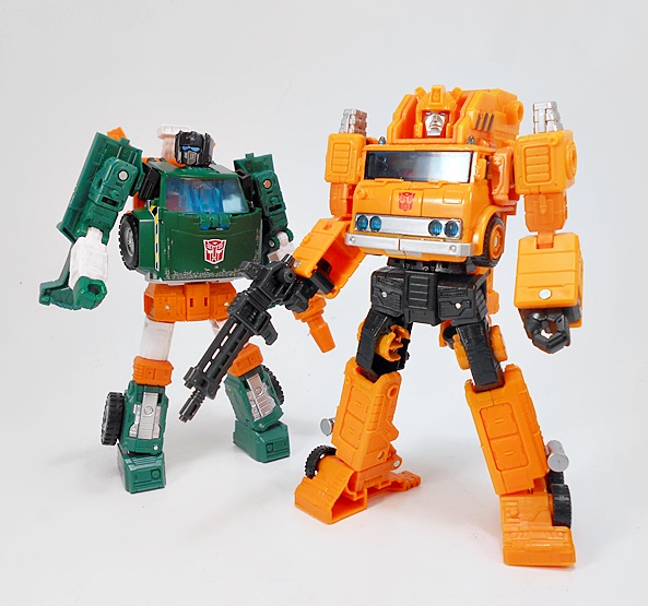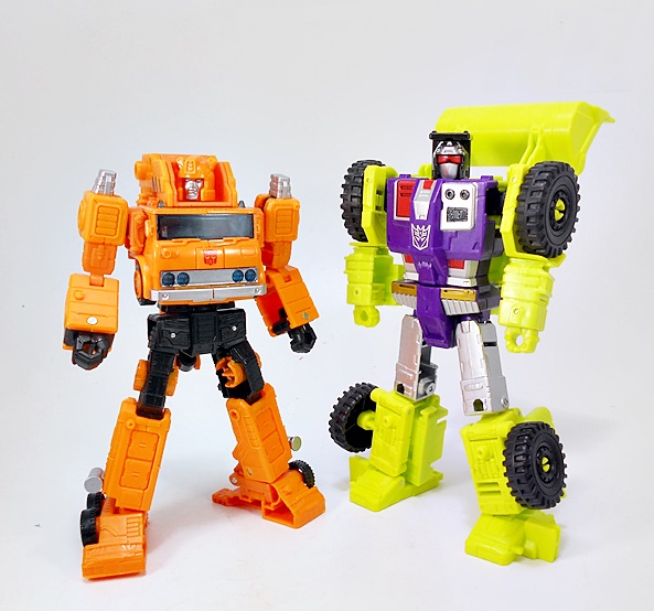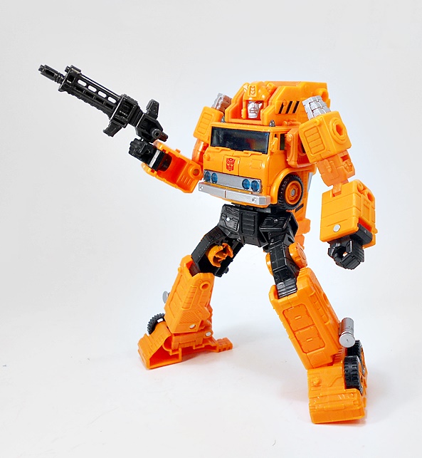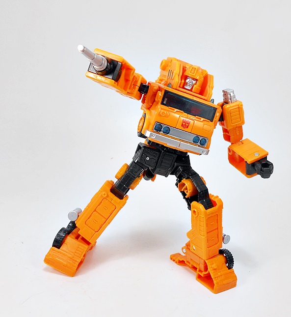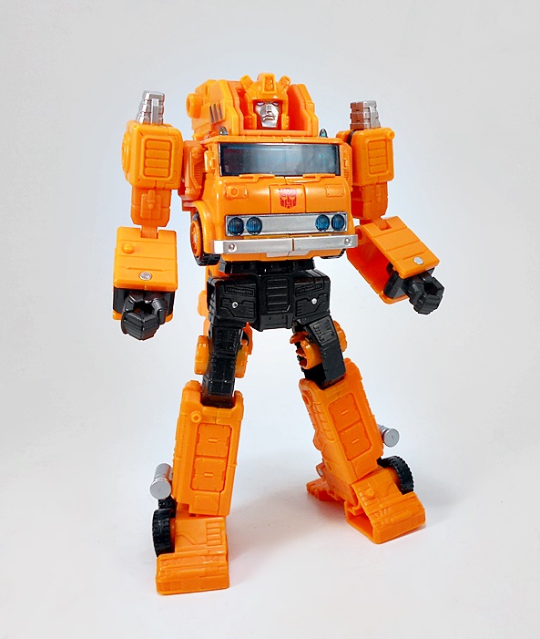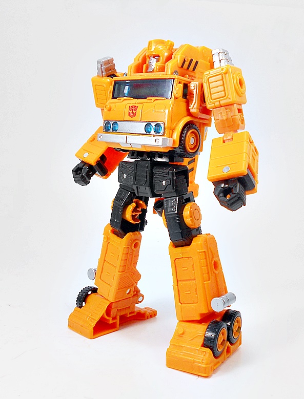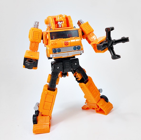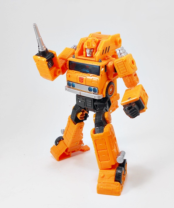 Transforming Grapple is refreshingly simple and very similar to his original G1 toy. There are absolutely no surprises here, but I can’t argue with how great the robot mode looks. He’s tall and lean compared to the squat chonk of Solar Storm Grappel. And while he lacks that certain hyper-realistic detail the previous figure had, I like the smooth and clean robot mode that’s presented here. I think it toes the line between updated toy and cartoon homage quite nicely. And I’ll always have a soft spot for Autobots that wear the front of their vehicle mode on their chest. IT just always feels so right! What’s more, Grappel’s crane collapses down and hugs close to his back to keep it from being too in the way. The wheel placement on the outside of ankles and above the hips is fantastic, and there are some very nice details sculpted on the lower legs. The coloring in robot mode is more or less the same as his vehicle mode, and this figure just proves that you don’t need a whole lot of paint operations to make it look good.