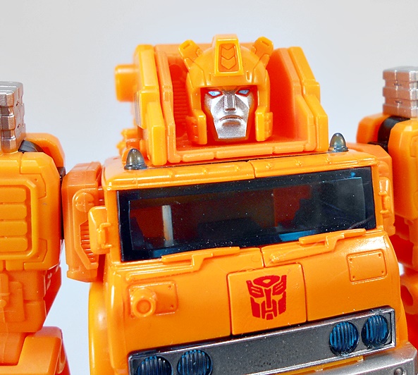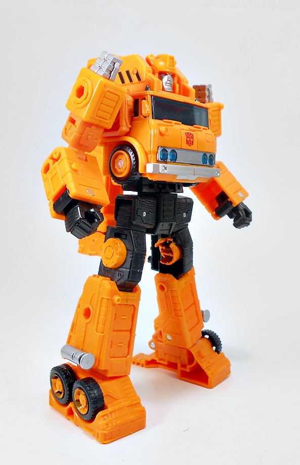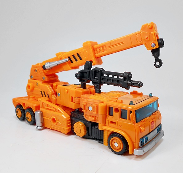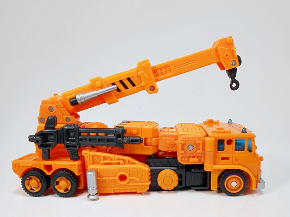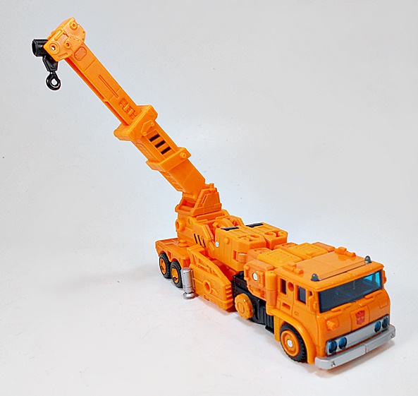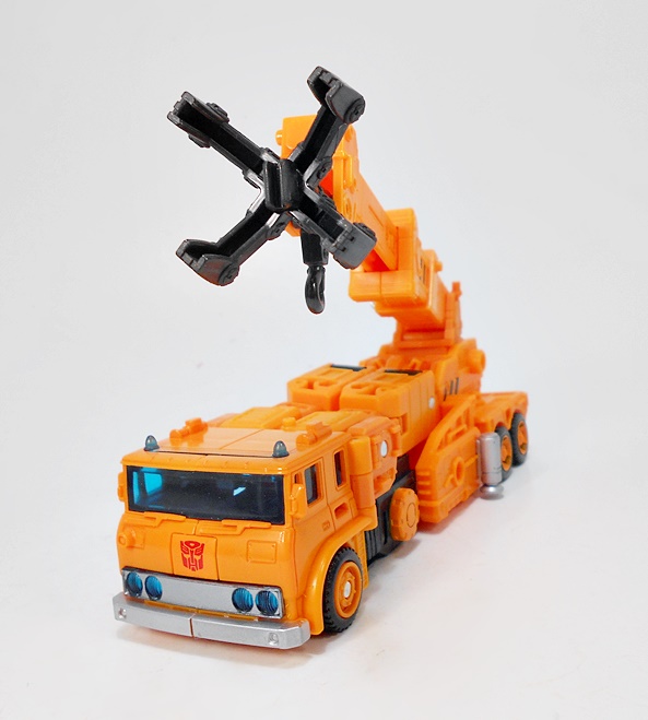 As for the deco, the bulk of the crane gets by with a lot of orange plastic. You do get some black on the wheels and a little more scattered about the body, and a little silver paint. There are also some black and orange hazard stripes. The cab gets the most flourish with some blue tinted windows, roof lights, and headlamps, and some silver on the bumper and grill. Grapple also wears his Autobot symbol proudly on the front of the cab. All in all, I’d say this is a really nice looking truck. It does feel like it may not have as much in the way of detail or paint applications as some of the other Earthrise figures, but that’s just my impression and I don’t think it hurts the toy at all.