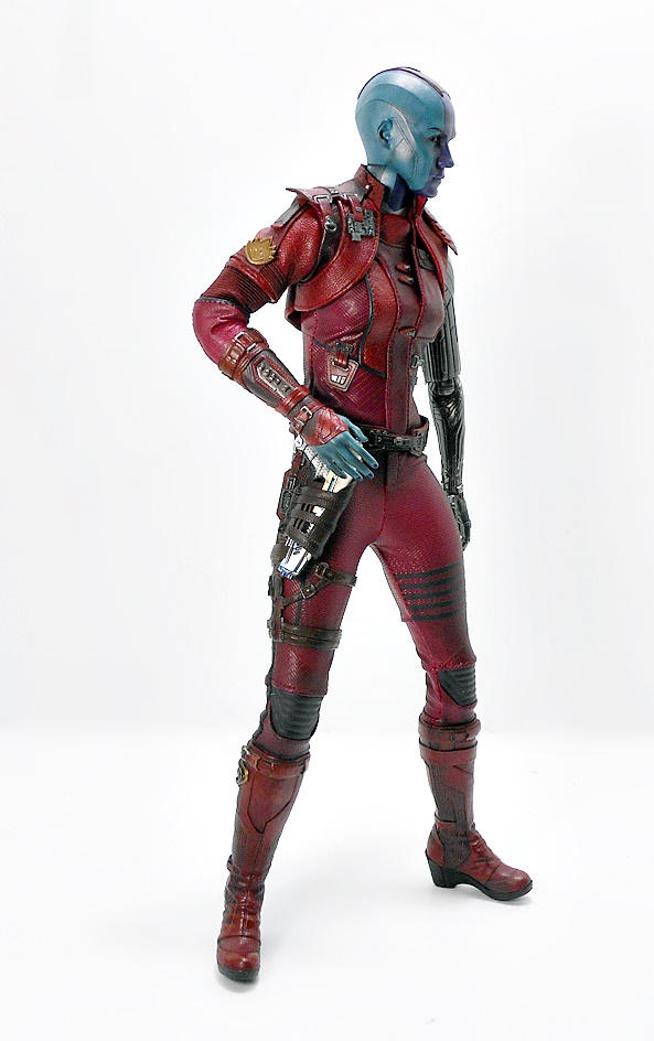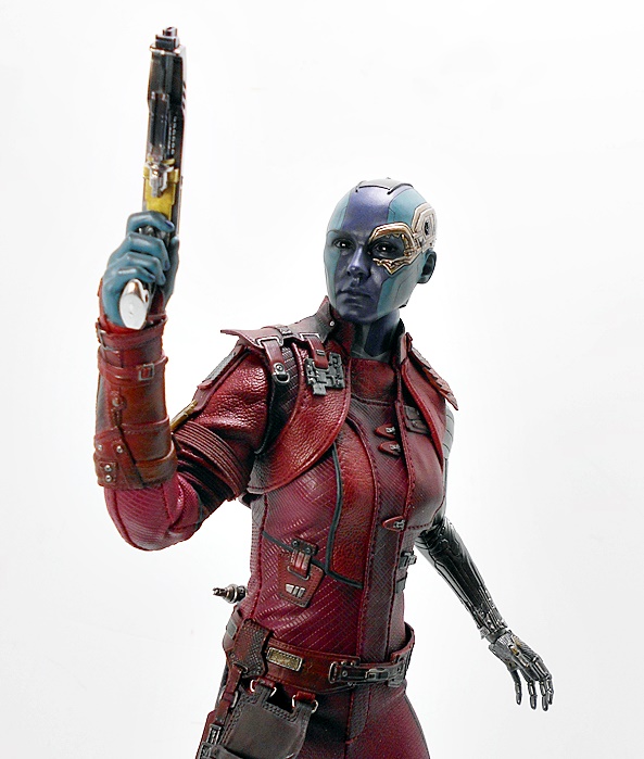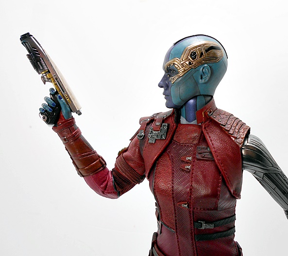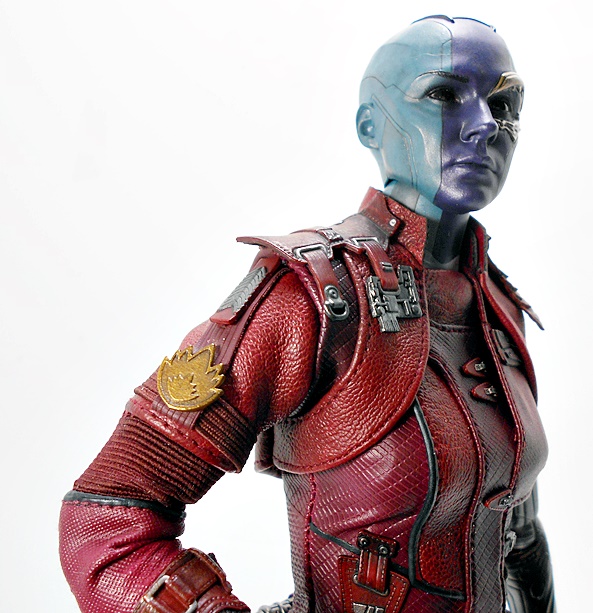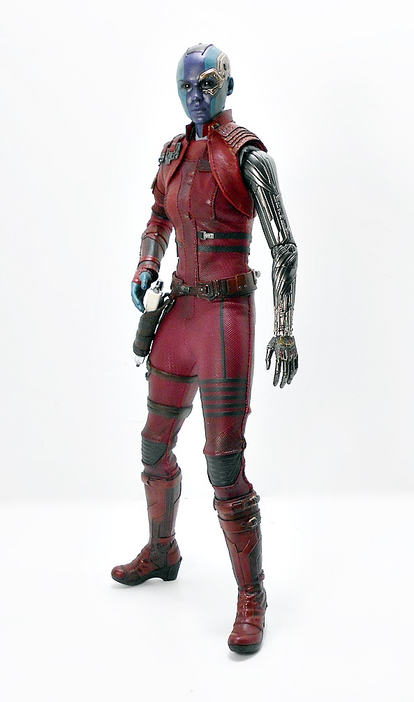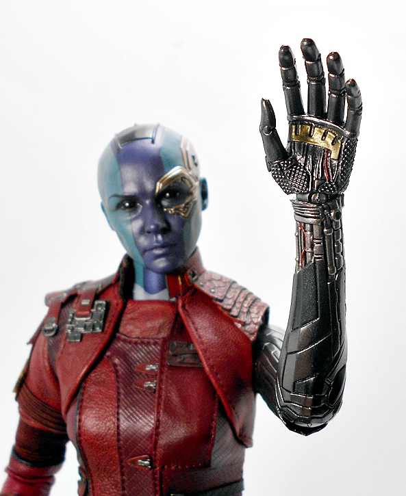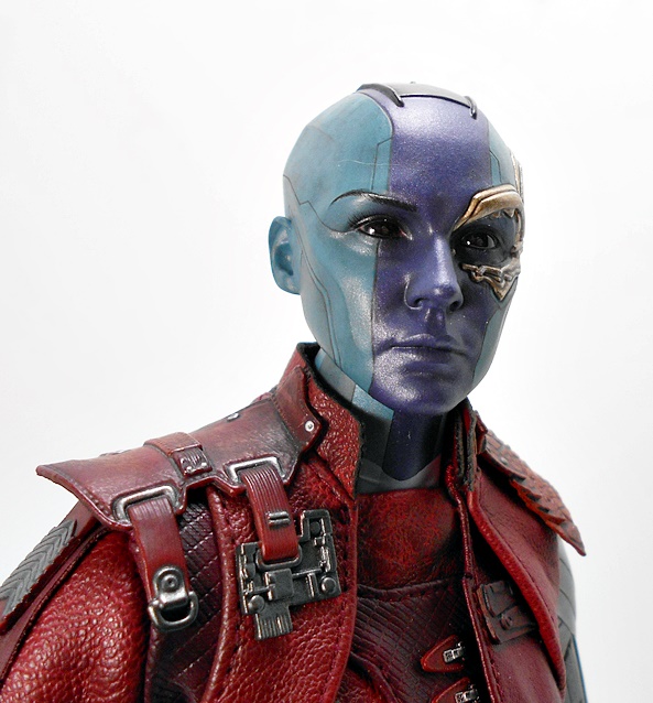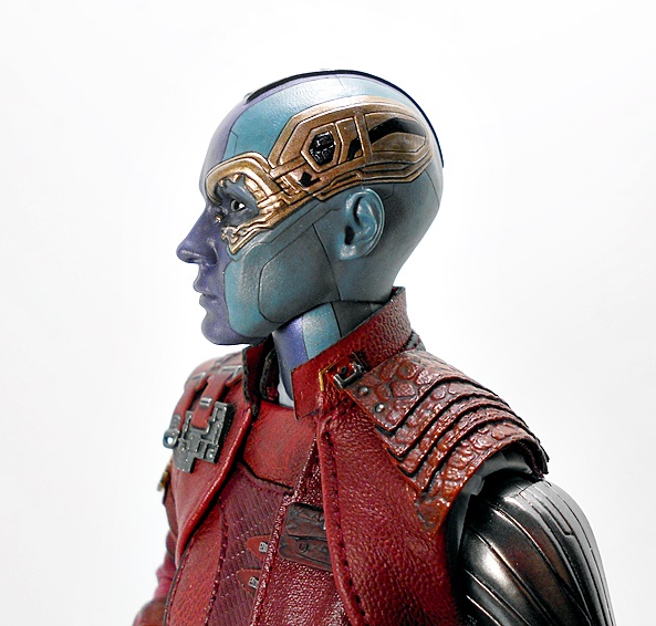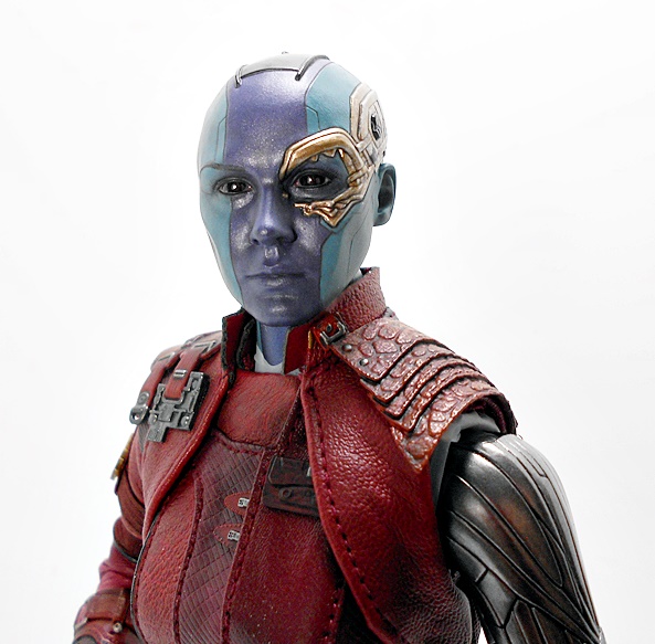 That brings us to the portrait, and for this I only have praise. Nebula’s on screen make up is nothing short of amazing. After following Karen Gillan in Doctor Who for so many years, I can only catch glimmers of familiarity of the actress as Nebula, and that’s high praise to her acting abilities as well as the make up effects. And this portrait continues Hot Toys’ mostly unswerving ability to capture likenesses for their figures. The two shades of blue used for her skin are rich and the metallic sheen on the darker middle is particularly beautiful. I also love how they managed to still create that realistic speckled skin tone even through such unconventional colors. The eyes also feature that lifelike spark that Hot Toys always manages to capture in these portraits. The expression is fairly neutral, which was what Nebula often showed in the films. A second head sculpt with gritting teeth and rage would have been welcome, but Hot Toys seldom seems to do multiple portraits these days. Finally, the exposed cybernetic plate on her left side and around her eye looks fantastic.