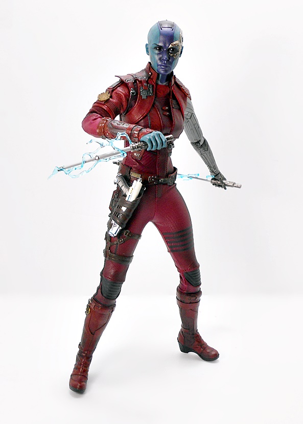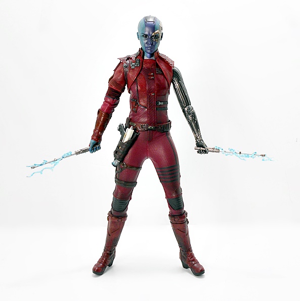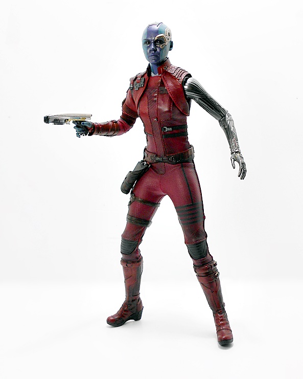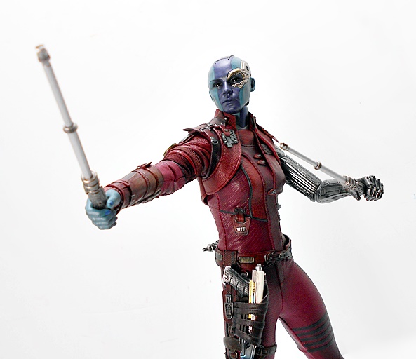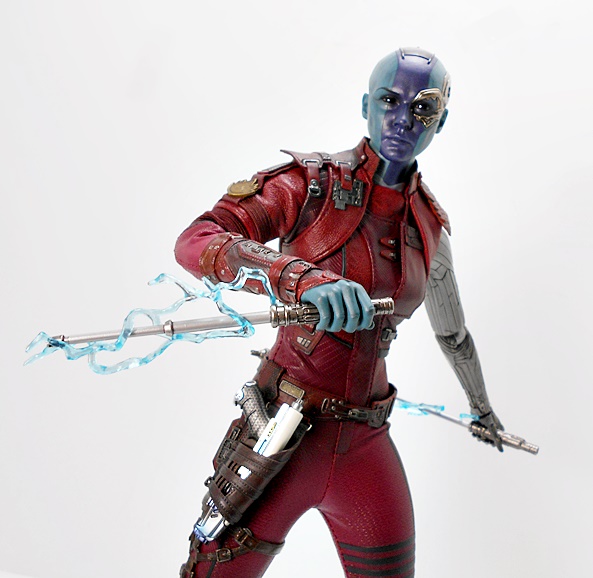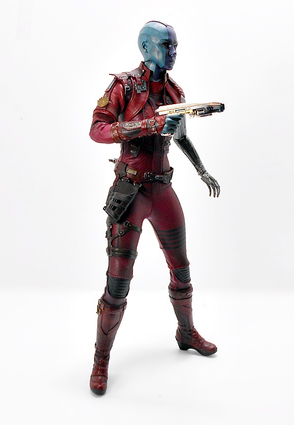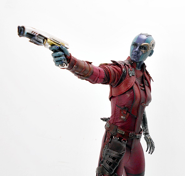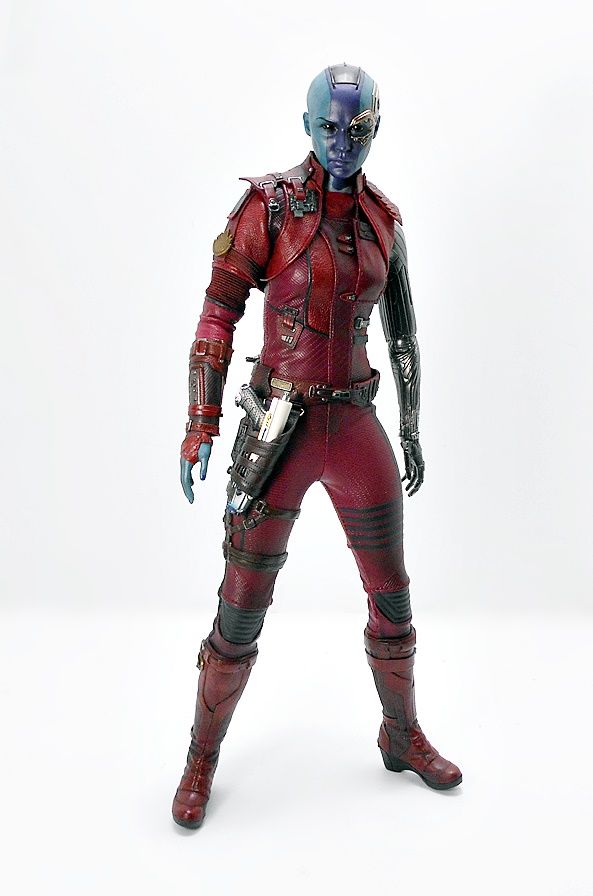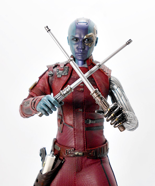 That brings us to the portrait, and for this I only have praise. Nebula’s on screen make up is nothing short of amazing. After following Karen Gillan in Doctor Who for so many years, I can only catch glimmers of familiarity of the actress as Nebula, and that’s high praise to her acting abilities as well as the make up effects. And this portrait continues Hot Toys’ mostly unswerving ability to capture likenesses for their figures. The two shades of blue used for her skin are rich and the metallic sheen on the darker middle is particularly beautiful. I also love how they managed to still create that realistic speckled skin tone even through such unconventional colors. The eyes also feature that lifelike spark that Hot Toys always manages to capture in these portraits. The expression is fairly neutral, which was what Nebula often showed in the films. A second head sculpt with gritting teeth and rage would have been welcome, but Hot Toys seldom seems to do multiple portraits these days. Finally, the exposed cybernetic plate on her left side and around her eye looks fantastic.