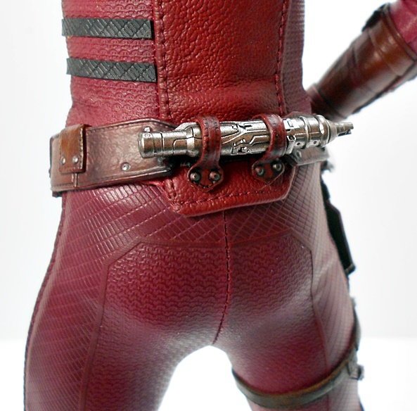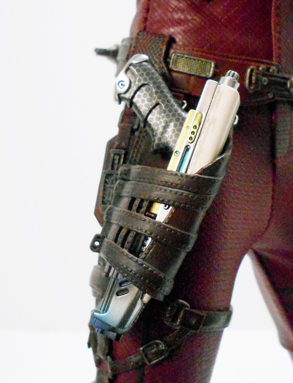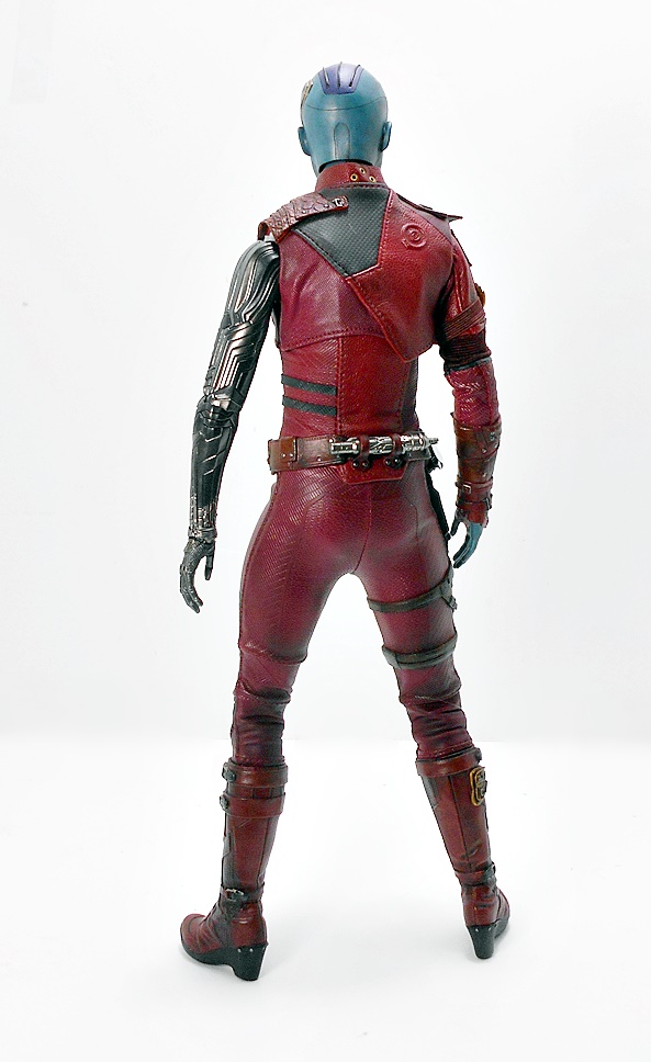 Plucked from Endgame, this is Nebula in her Ravager garb, and if she’s only getting one Hot Toys figure, I’d say this version was a pretty good choice. Although, I still would have liked one from either of the Guardians flicks, since we didn’t get Ronin and it would have been nice to get bad Nebula as a villain stand in. Still, the Ravager style outfit displays well with my original Guardians Star Lord and my Guardians Vol. 2 Yondu, so I’m a happy collector. The space-pirate outfit consists of a very tight-fitting maroon one-piece, which is stitched together in a bit of a patchwork fashion, and while this isn’t one of the flashiest costumes out there, Hot Toys did it proud by recreating all of its little idiosyncrasies. Every stitch of it has some form of texturing, plus there are multiple layers with different types of fabrics, reinforcements, piping, belts, and buckles. When I first got the figure out of the box, I had a great time just studying all of these little details and marveling at how with something like 50 Hot Toys figures on my shelf, the attention to details never ceases to impress me. I especially love how the sculpted bits that make up the boots and bracers and gloves pair so seamlessly with the actual fabric aspects of the suit.