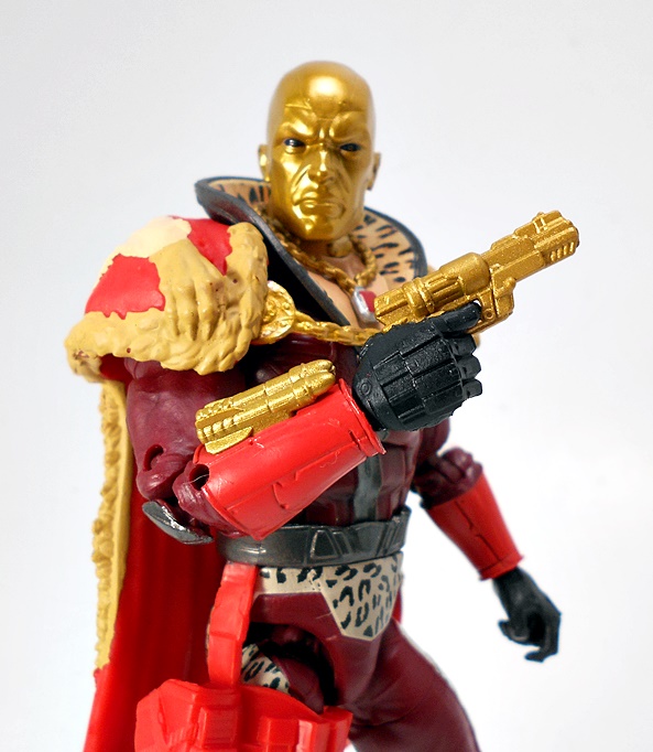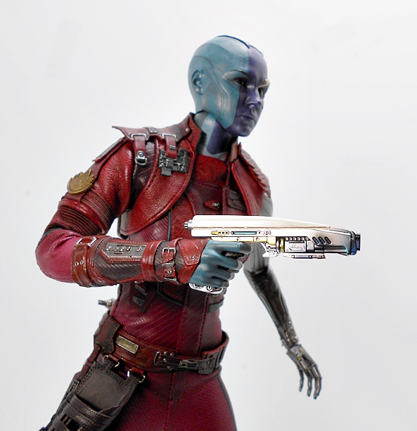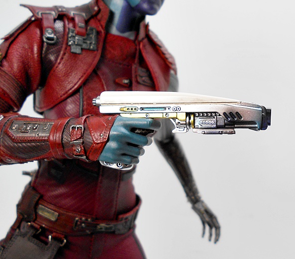 Nebula does not come with a whole bunch of accessories and extras, but what we did get is pretty good. For starters, her pistol is a real thing of beauty. I love the gun designs in the Guardians flicks, and this one looks like it shares a little heritage with Star Lord’s Elemental Guns. At the very least they look like they come from a shared Universe. The grip has an intricate honeycomb pattern and the rest of the tiny details include a knob on the back, little screws, and there’s even some burn marks painted around the three vents near the muzzle. The top piece is ivory, the bulk of the body is painted with a brushed steel finish, and there’s a little metallic blue and gold on some of the fixtures. It’s quite a striking piece!