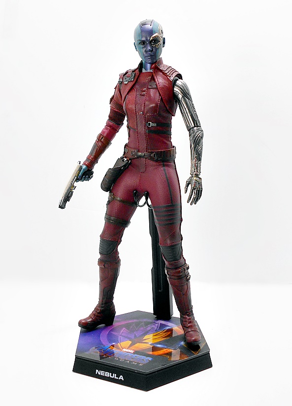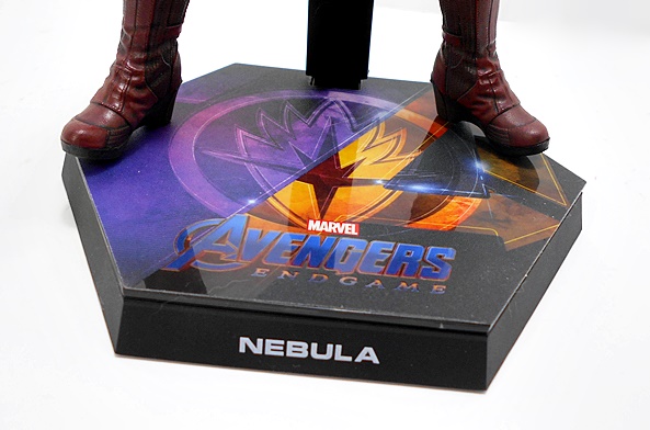 As always, our last stop on the Hot Toys review train is the figure stand, and here we get one branded for Endgame. It features a hexagonal base with a standard, adjustable crotch cradle post. Her name is printed kind of unceremoniously on the front, instead of using one of those metallic name plates. Also, the printing is ever so slightly askew. Ah well. You do get some really nice and colorful artwork on the base with the Avengers Endgame logo and the Ravager emblem. And yeah, I really wish they had given her the same style of stand the rest of the Guardians had, because this one looks really out of place in that display.