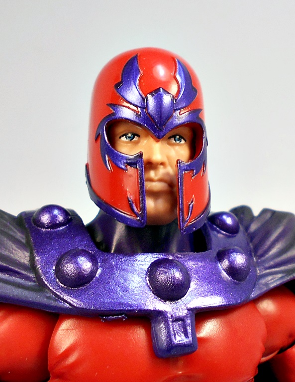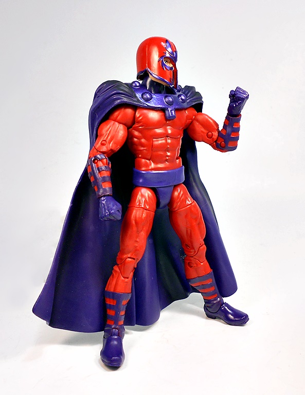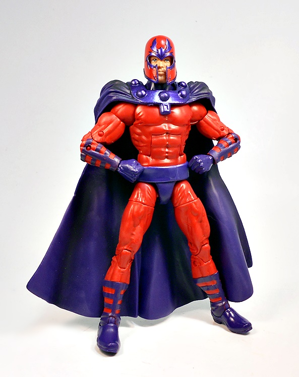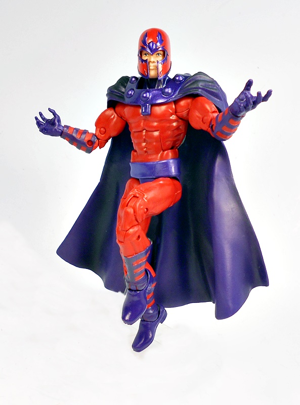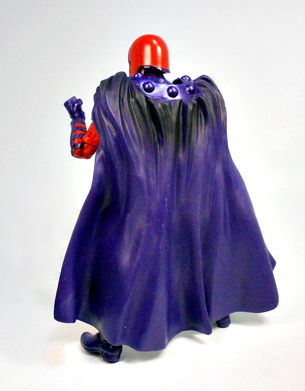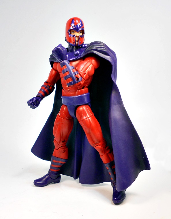 We last saw Magneto a few years back as part of the Apocalypse Wave in his more modern costume, but this time Hasbro went for the classic look. I really liked that previous release, but I absolutely LOVE this one. This is my favorite look for the character and this figure pulls it off so well. The one-two punch of crimson red body suit with purple boots, gauntlets, belt, undies, and cape look swonderful, and I really dig the cut-outs on the boots and gloves. The cape is both majestic and cumbersome, and to be fair I’m not sure they could have pulled off one without the other. The heavy bolted piece that crosses above his chest isn’t enough to counterbalance all that plastic hanging behind him. Fortunately, the cape is long enough to help serve as a stand in a lot of poses.