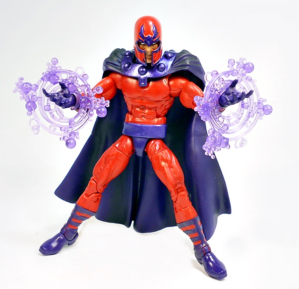 Magneto comes with two sets of hands, fists and power wielding hands, and he comes with those ubiquitous energy funnels that we saw last time with Polaris and Havok. I hope whoever designed those babies is working on commission! Here they are translucent purple and they look really good! Moving on to our last stop, Scarlet Witch!