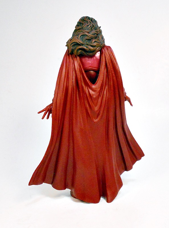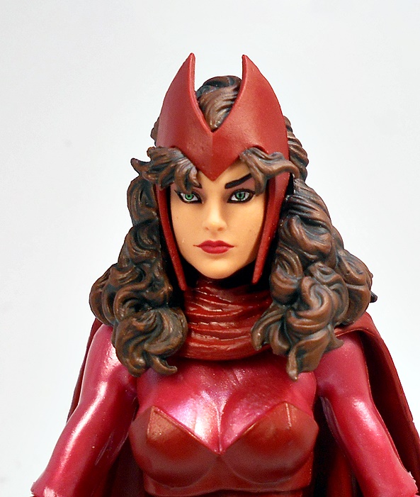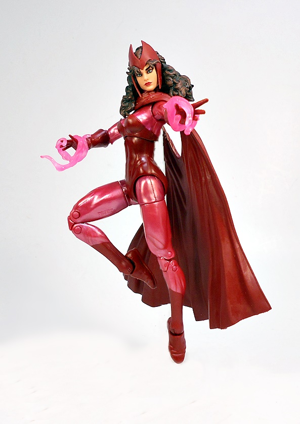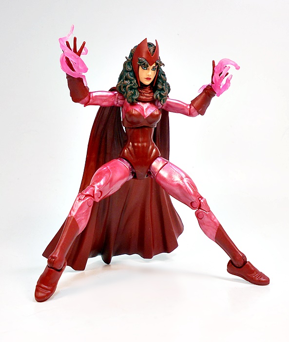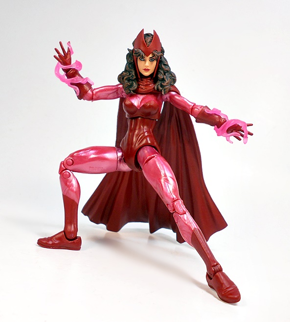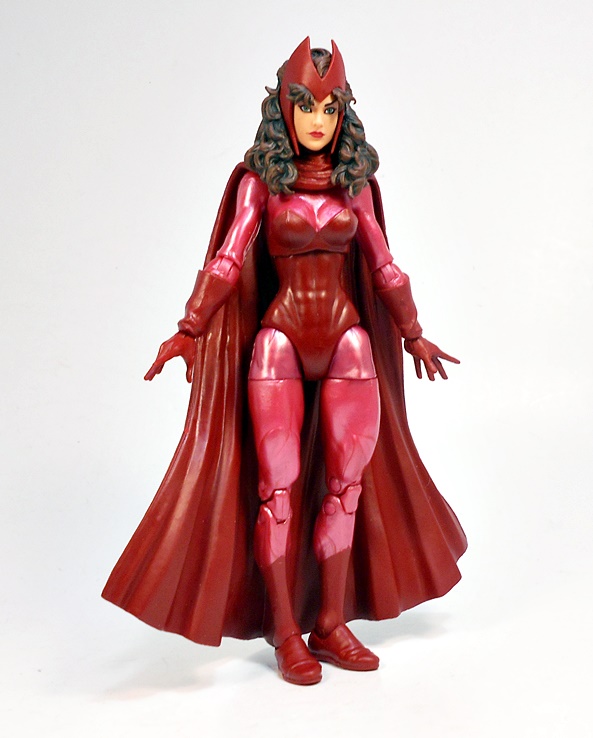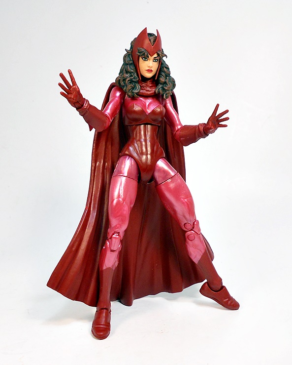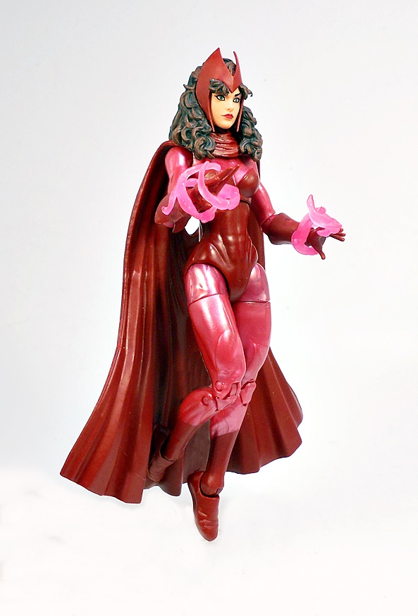 It’s been over five years since a comic version of Scarlet Witch turned up in the modern Legends line. That was such a great figure, I really had no desire to replace her. But Hasbro has come a long way since then and this new version is a vast improvement in a lot of ways. To be fair, this is a slightly different costume with different coloring, so whether this one is better or worse, may come down to personal taste. Here, Wanda is wearing a full pearlescent reddish-pink body suit with scarlet paint used for the boots, gloves, one-piece, and cape. The deco is more limited here, but it still looks quite striking. The cape plunges in the middle behind her neck, and fans out toward her feet. Perhaps one of the most obvious differences with this figure is the re-sizing. The previous Scarlett Witch is an absolute giant compared to this release.