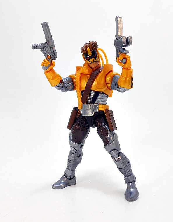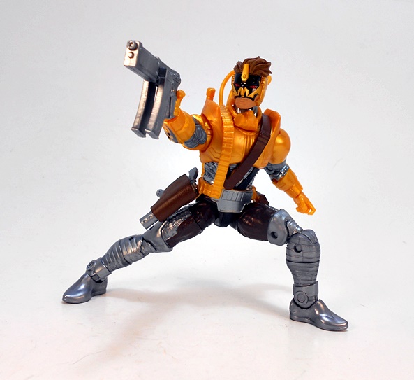 He also comes with his more iconic weapon, with the squared off muzzle and dual magazines.  Both weapons are cast in silver-gray plastic and feature some nice attention to detail in the sculpt. He also sports both left and right gun-toting hands so he can dual wield. Alas, there’s nowhere to store this one.
