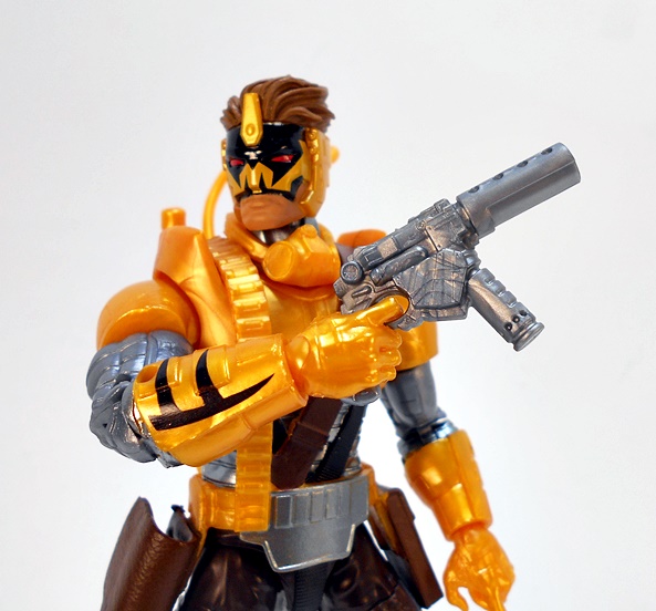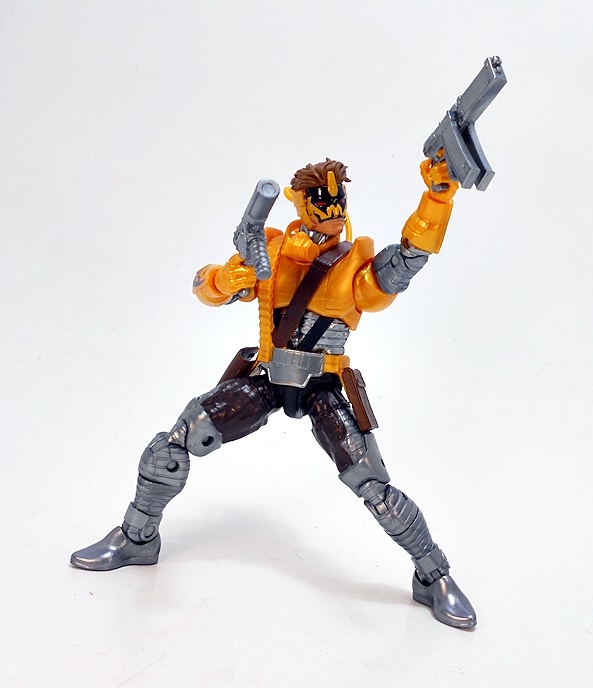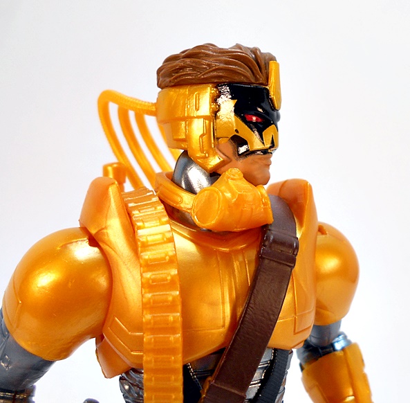 Even if you have no real affinity for Maverick, you have to admit that his armor is fab, and Hasbro did a fantastic job rendering it here in six-inches of articulated plastic. He’s got silver armor running up his legs to just above his knees, with segmented section below the knees, but not much going on for protection in the upper legs and groin. Maybe not a problem for someone who can absorb concussive force, which I would assume includes getting kicked in the gonads. You get a silver plate in front of his belt, and the segmented silver armor continues up to his torso and arms. Reinforcing the torso and arms is some beautiful gold plate for his upper body, shoulders, and gauntlets. The gold plastic has a little bit of that swirly effect you sometimes see, but it’s better quality than some of the gold plastic Hasbro has used in the past. Indeed, I think it looks great. Maverick has a brown shoulder strap over his armor, a brown pouch on his left hip, and a functional holster on his right hip. On his back, he wears a booster pack to amplify the energy he absorbs, complete with flexible tubing running from the top into Maverick’s mask. Hot damn, this guy looks great!