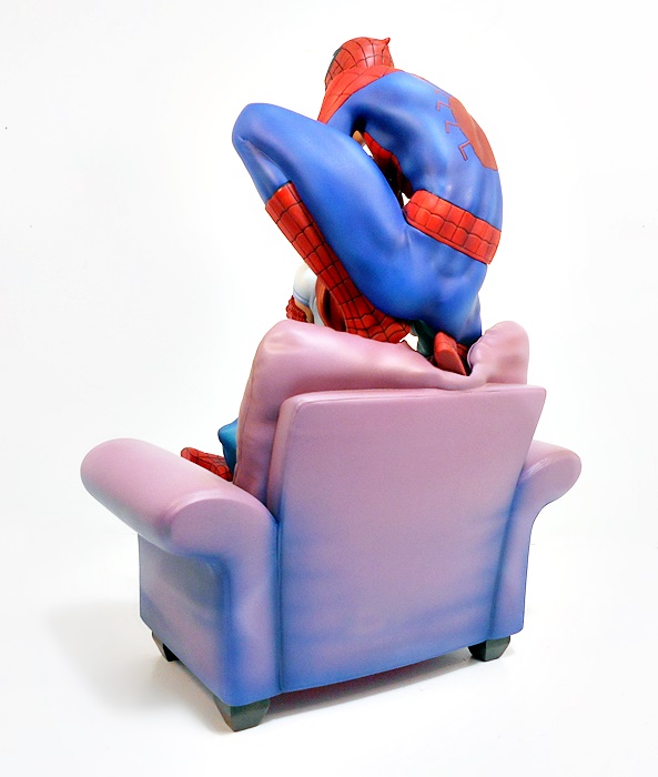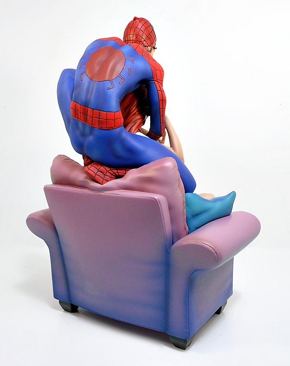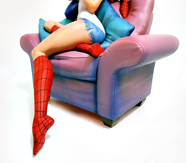And here is the piece all set up and I am absolutely in love. The composition sees MJ reclining on a comfy purple armchair, propped up on a couple of blue pillows, with one leg out and the other folded back under it. Meanwhile, Peter squats on the back of the chair, unmasked but still in his Spidey outfit. Their arms are intertwined, framing MJ’s face in the center. I was especially curious to see how they were going to engineer that web of arms, and the execution was quite clever, and the connections are for the most part fairly seamless. Spidey is secured to the chair with a peg, but MJ simply rests in molded indentations in the chair, and yet it still feels solid, even when I was transporting it from the studio to the display shelf. It is a satisfyingly heavy piece, mainly because the sofa is a solid block of polyresin.