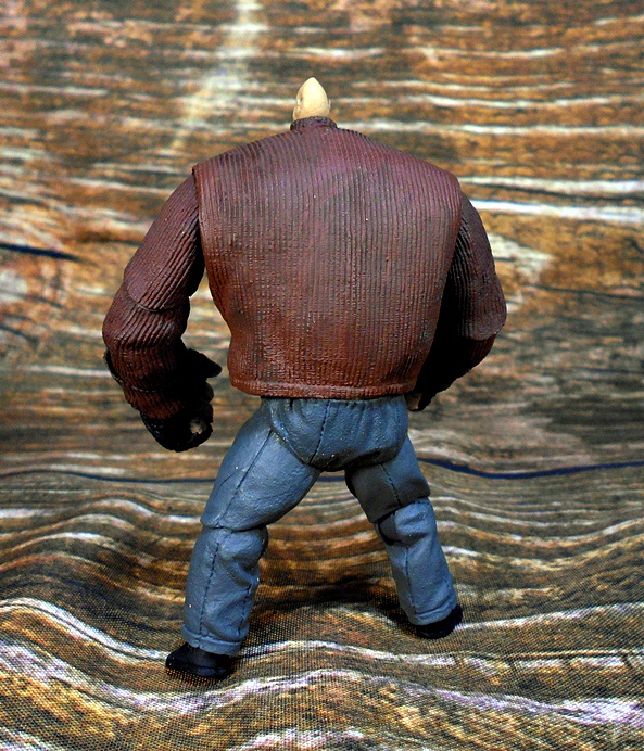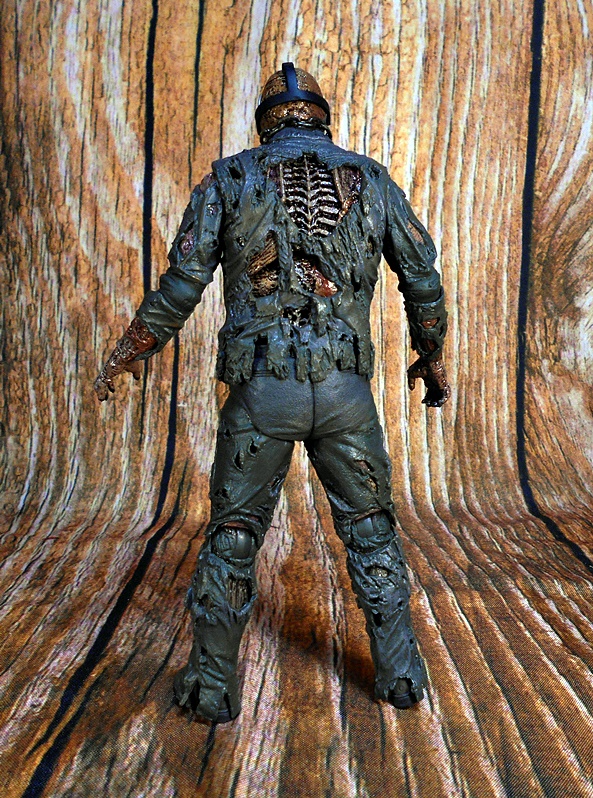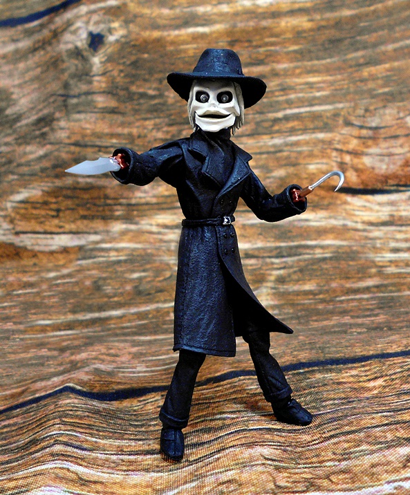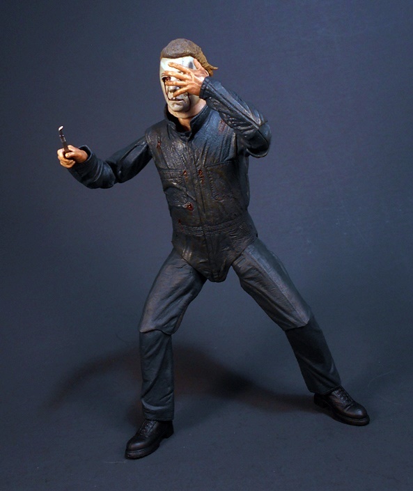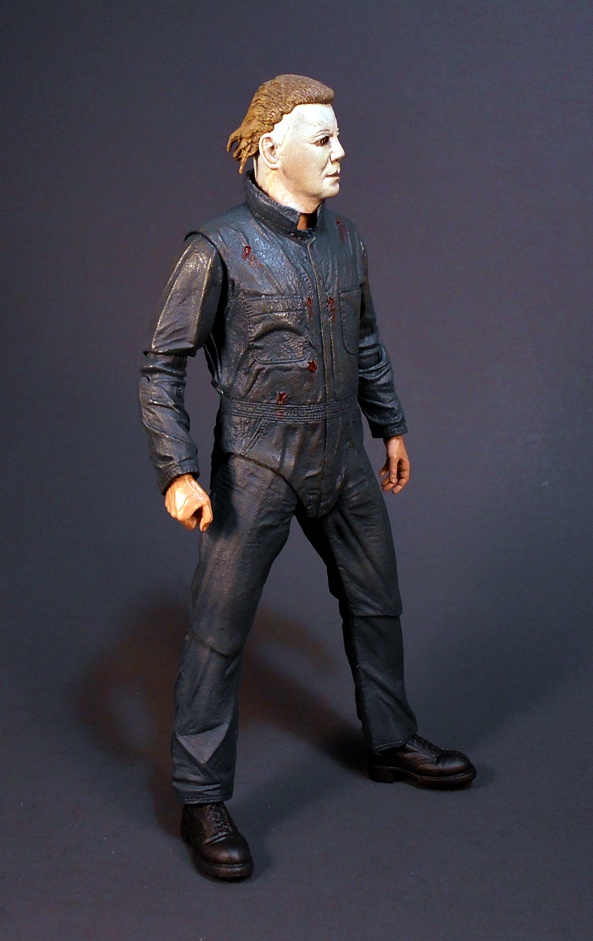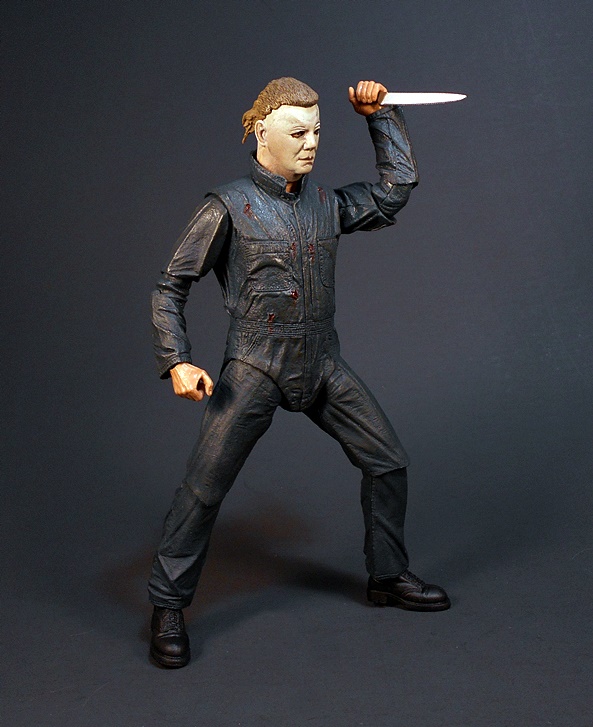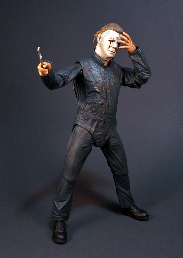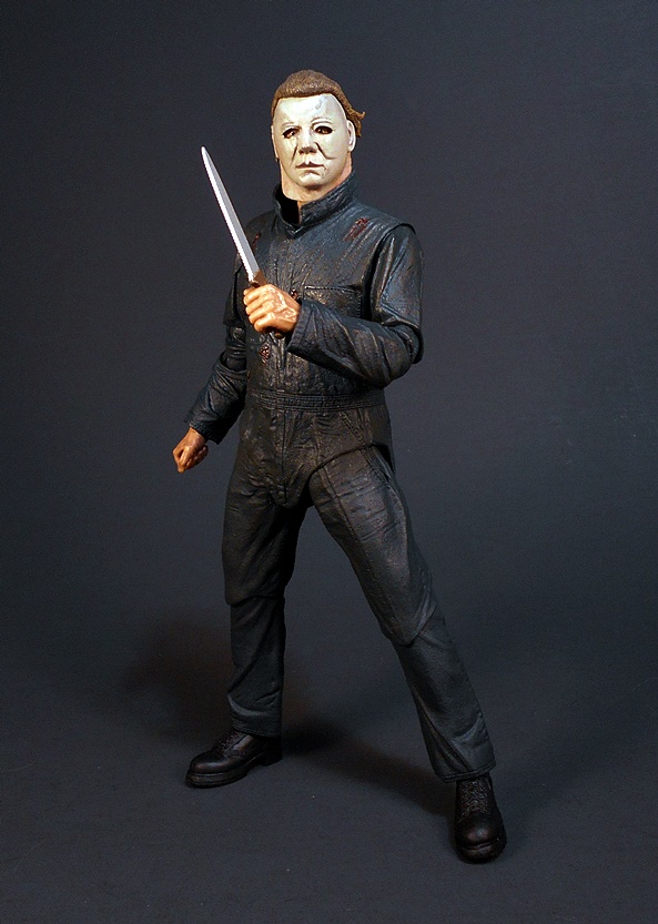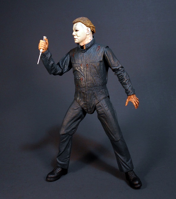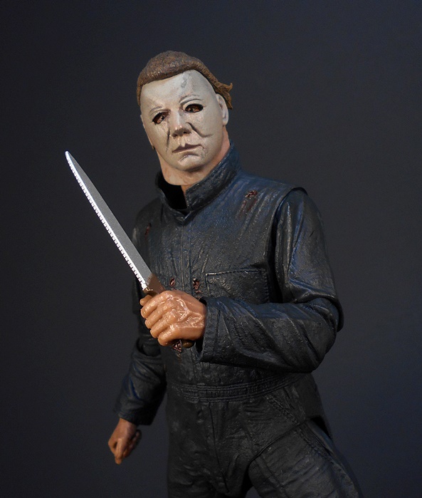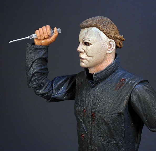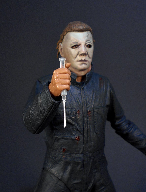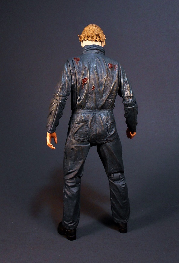 The film begins exactly where the first one ends, so we get more or less the same version of Michael for either movie. The one big difference here is the bullet holes where Loomis “SHOT HIM SIX TIMES… SIX TIMES!!!” The Shape dons his dark blue jumpsuit with all the little sculpted stitches that I’ve come to expect from NECA’s plastic tailors. And the rumples! Oh, the rumples! Someone at NECA is just a master at sculpting rumples and wrinkles in plastic clothing. He has a pair of matte black work boots, and his collar is worn up. The jumpsuit that covers the torso is cast in soft plastic and conceals the articulation there. Otherwise, you get plenty of rotating hinges, including doubles in the elbows, which is just fantastic for the stabbing!
