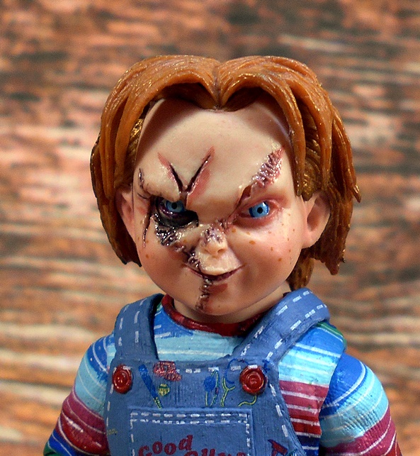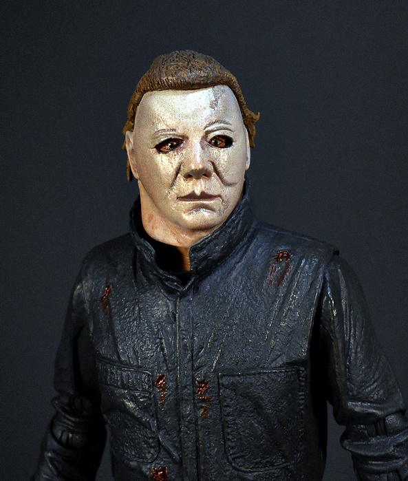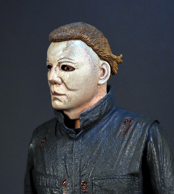 You get a whopping three heads with this figure! The first is the standard mask and it looks amazing. This appears to be an actual mask that is permanently attached to the head, which gives the eyes a nice sense of depth, as does the way the neck of the mask sticks out over the figure’s actual neck. The texturing on the pale mask is masterfully done so as to look like vinyl and not real skin. The hair also appears to be sculpted separately, giving it a clean hairline. I really liked the look of the modern, damaged mask in Halloween Kills, but this original will always be my favorite.