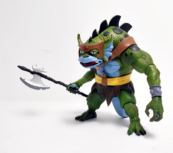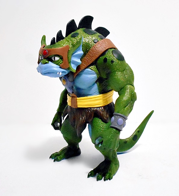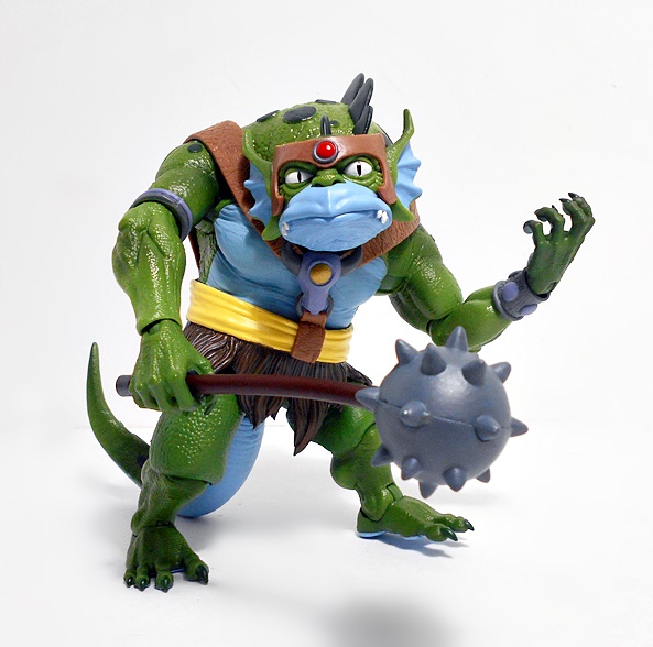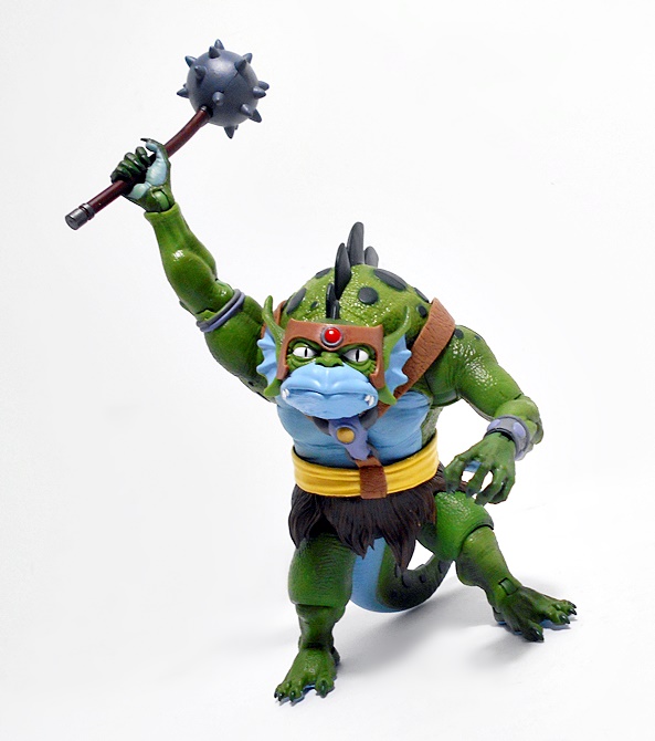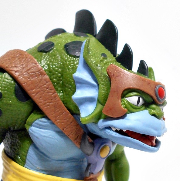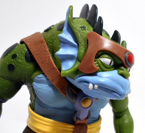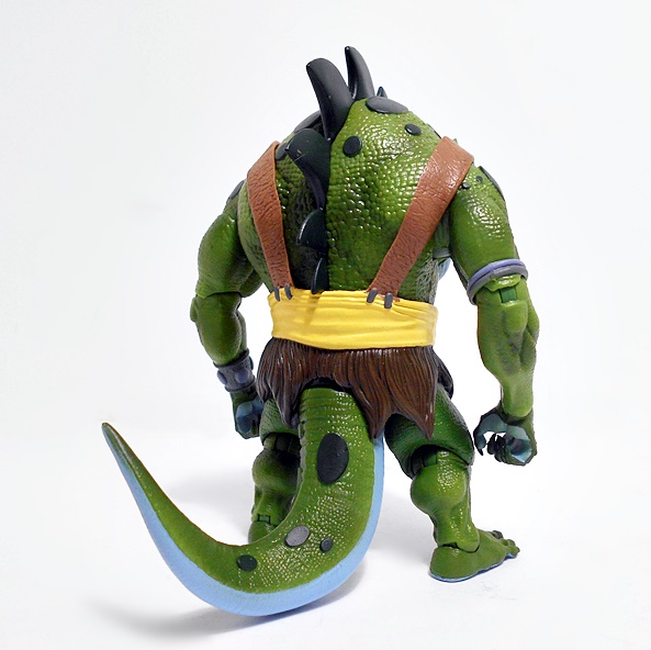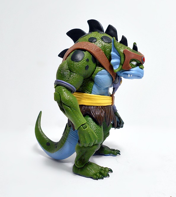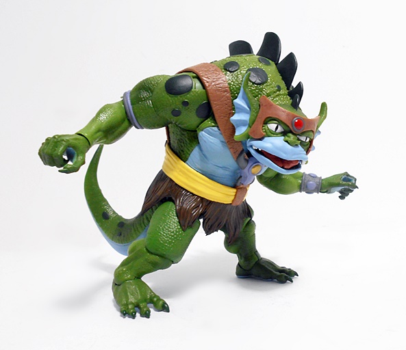 Slithe is indeed a big boi, with a lot of satisfying heft to the figure. His stocky, hunched body is beautifully recreated here in what is a wonderful compromise between realistic detail and the simple nature of his cartoon counterpart. His green skin is textured with reptilian scales, along with smooth patches scattered throughout, and a smooth, light blue surface for the undercarriage of his tail and his chest. Personally, I would have liked that light blue to be closer to a greenish-gray, but I still think it looks good. He’s got a yellow sash tied around his waist, secured by a Y-shaped harness with two brown suspenders running up from the back, over his shoulders and joining together in the center of his chest at what looks like a steer’s head fixture. Below the yellow sash he has a shaggy brown skirt that covers the modesty of his lizard-goodies. His tail curls up behind him, and his hump is crested with dinosaur-like spikes. The sculpt and coloring on display here are both fantastic, and this figure not only looks great, but feels incredibly solid in hand!