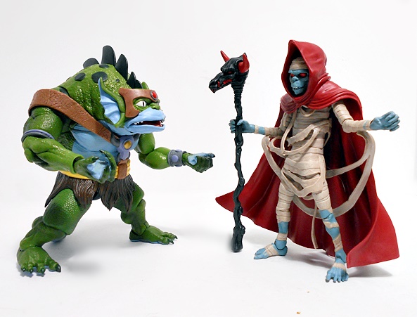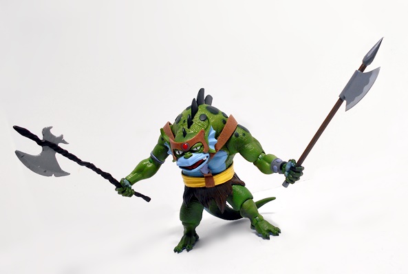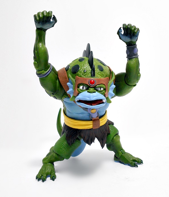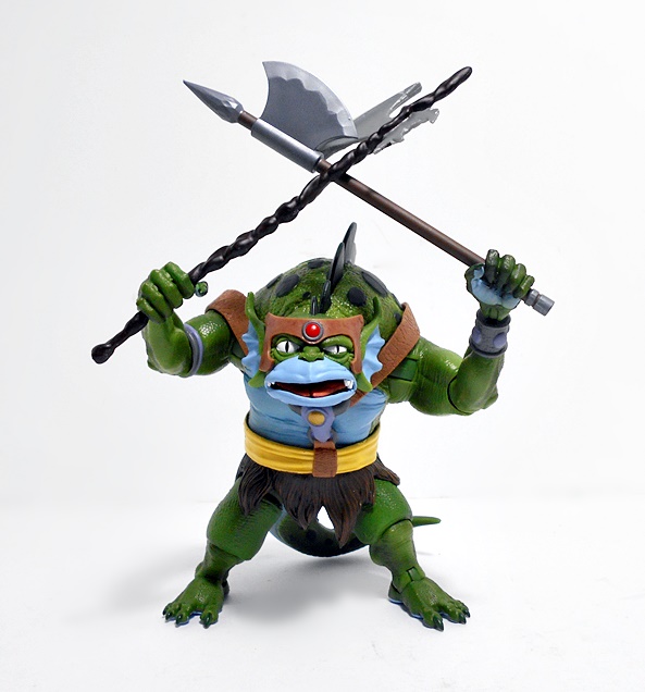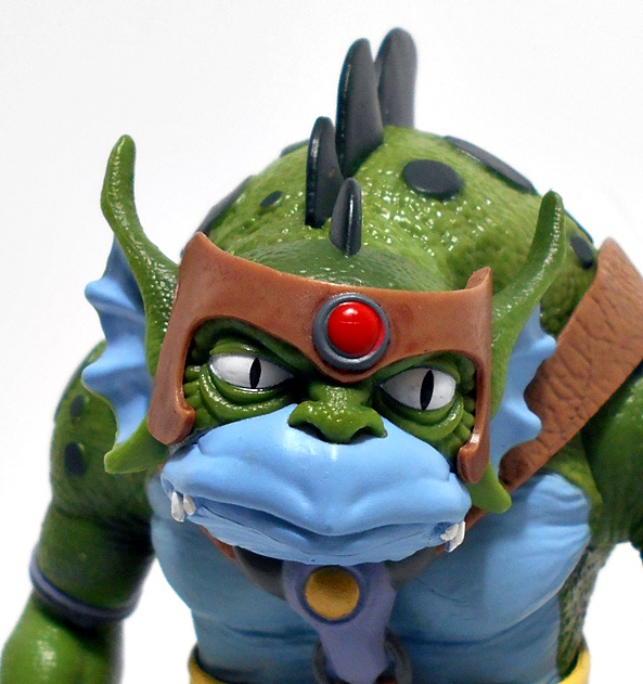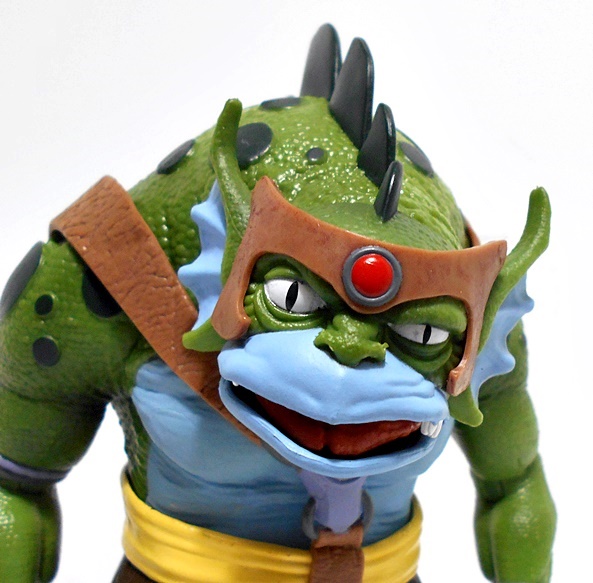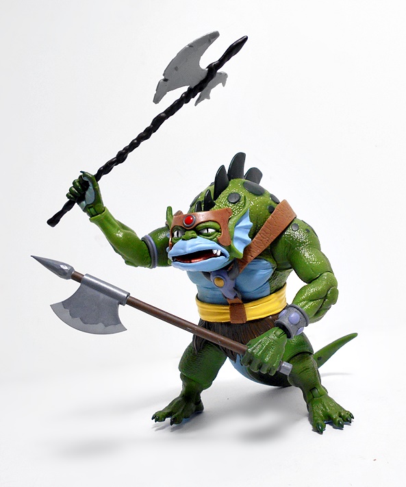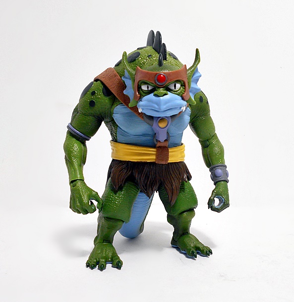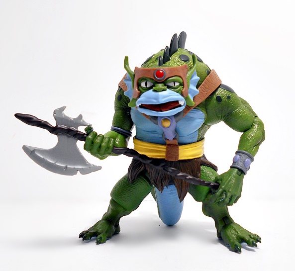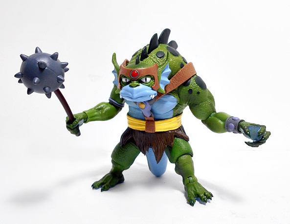 Slithe is indeed a big boi, with a lot of satisfying heft to the figure. His stocky, hunched body is beautifully recreated here in what is a wonderful compromise between realistic detail and the simple nature of his cartoon counterpart. His green skin is textured with reptilian scales, along with smooth patches scattered throughout, and a smooth, light blue surface for the undercarriage of his tail and his chest. Personally, I would have liked that light blue to be closer to a greenish-gray, but I still think it looks good. He’s got a yellow sash tied around his waist, secured by a Y-shaped harness with two brown suspenders running up from the back, over his shoulders and joining together in the center of his chest at what looks like a steer’s head fixture. Below the yellow sash he has a shaggy brown skirt that covers the modesty of his lizard-goodies. His tail curls up behind him, and his hump is crested with dinosaur-like spikes. The sculpt and coloring on display here are both fantastic, and this figure not only looks great, but feels incredibly solid in hand!