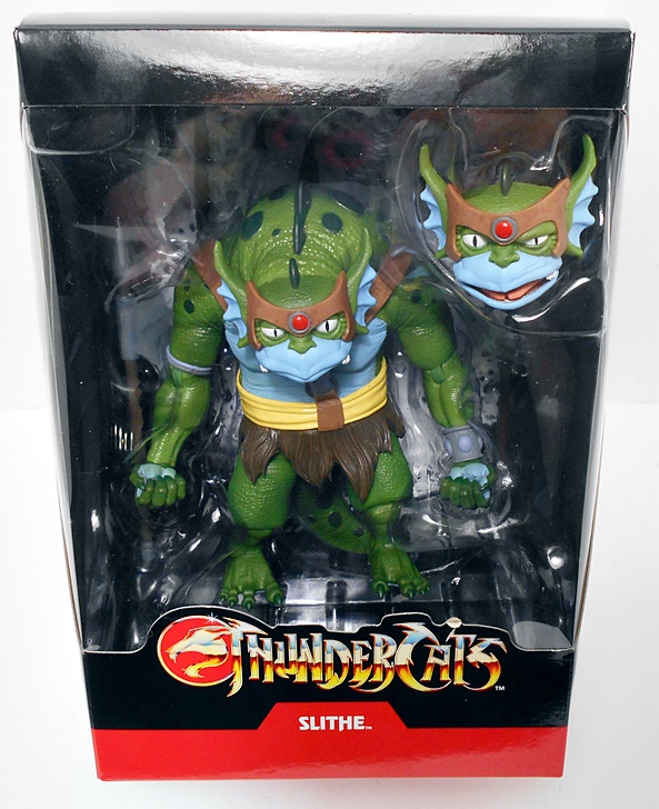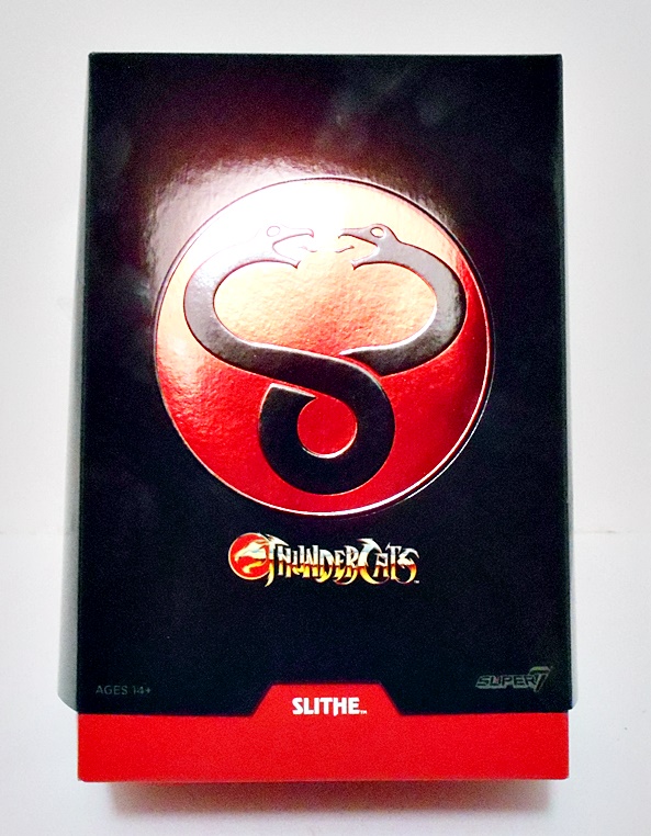 And who better to kick things off than with Slithe, Yesssss? As the de facto leader of The Evil Mutants from Plun-Darr, Slithe is without a doubt the most coveted release in this wave! Not only is he an important character, but he’s also one of the more unique character designs of the Mutants, and I was beyond curious to see how his figure would turn out. The packaging is super snazzy with a cover featuring the red foil insignia of Mumm-Ra The Ever Living. Lift the cover off to reveal the window box within. We can see the figure from the front and from the back some character art and a blurb about Slithe. Inside, the figure comes on a hefty tray with a second tray containing the accessories, nested under it.