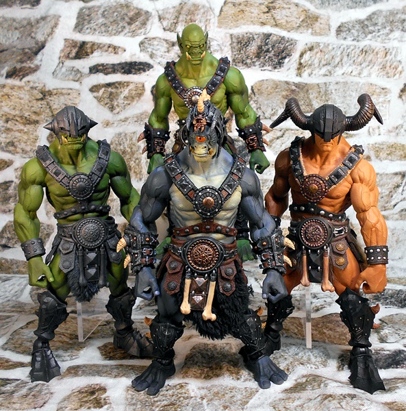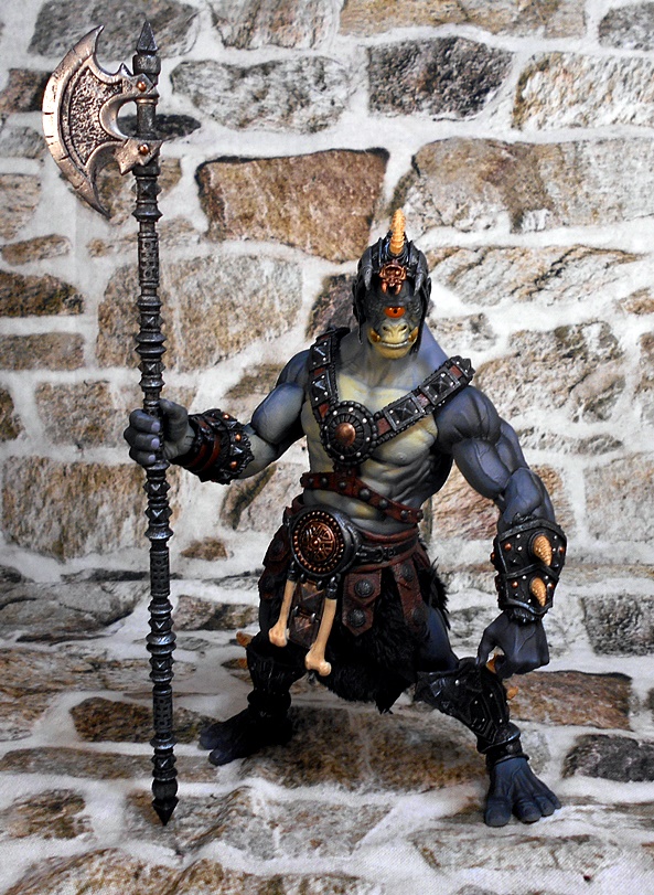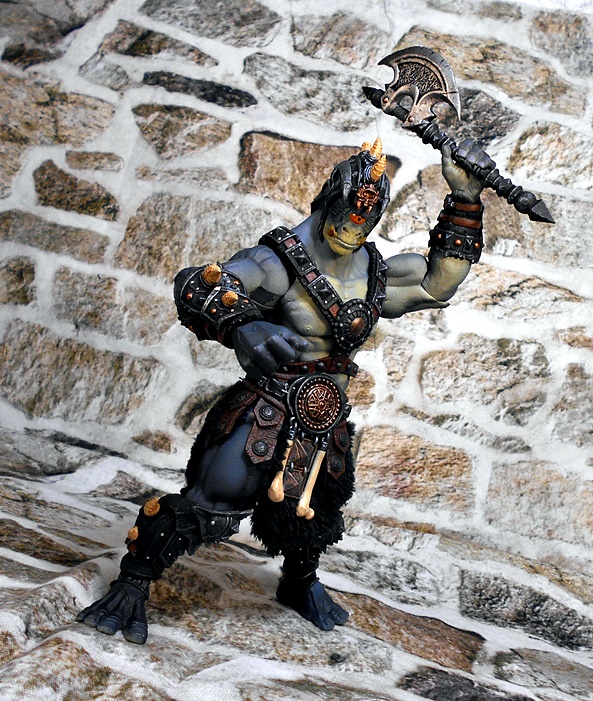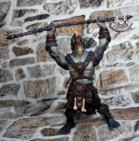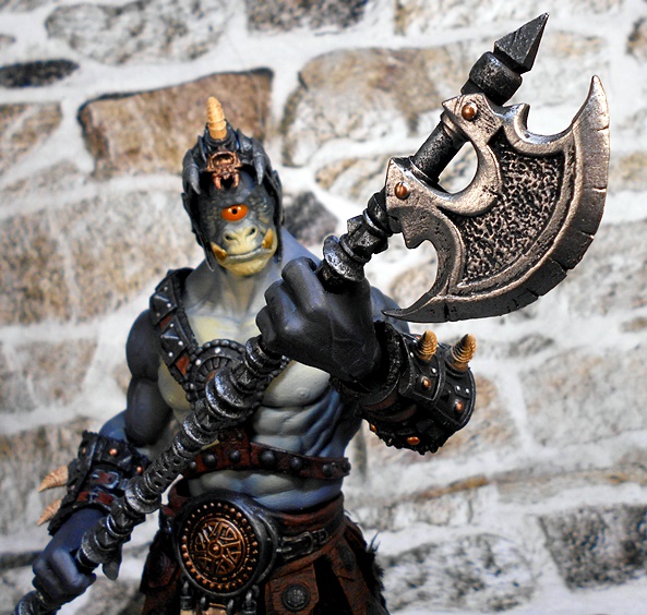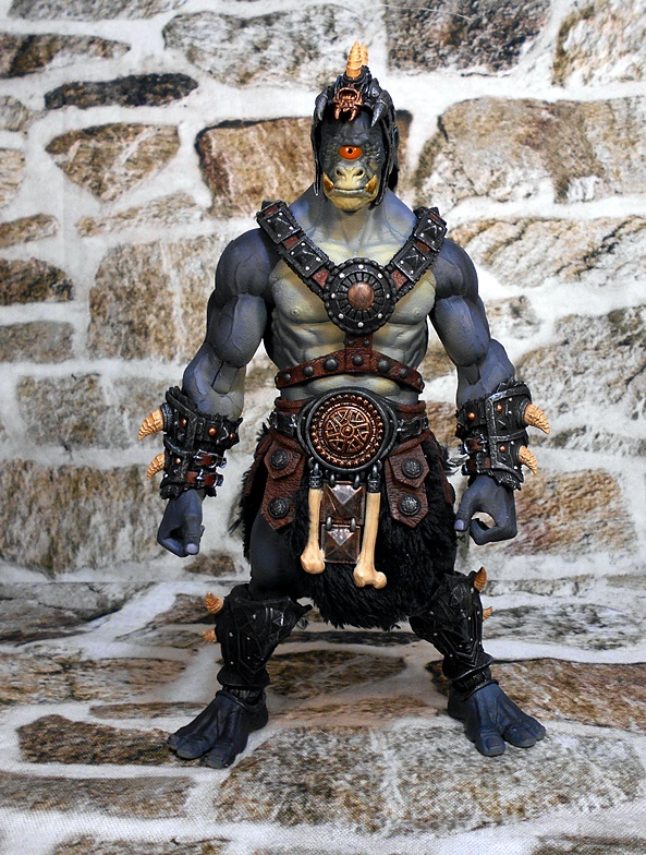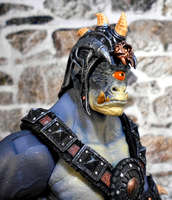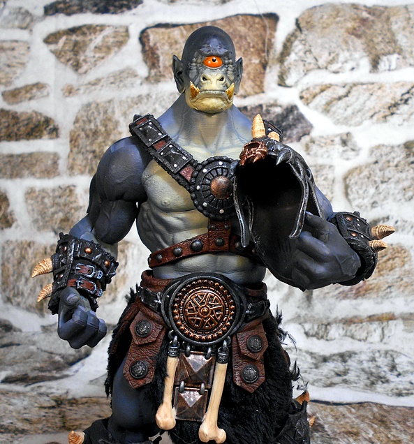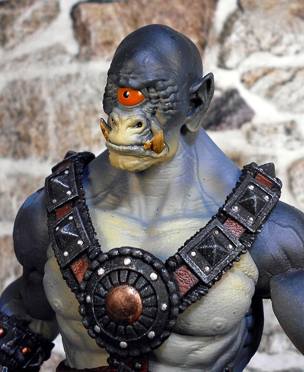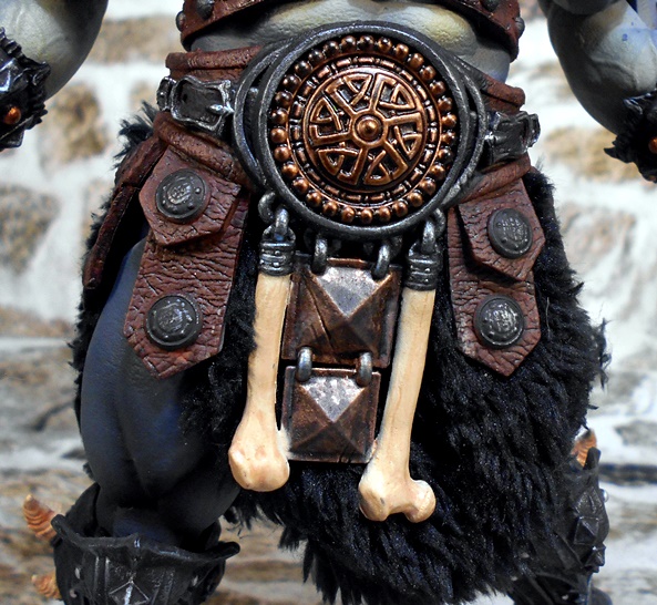 The helmet is a close fitting skullcap with thin cheek guards, which drop down in front of his pointed ears. The mohawk of boney spikes looks great and matches the bones that protrude from the arm and leg armor rather well. The helmet is removable, and it can even be worn by Kkurzog or the Ogre Legion Builder if you like. This was a nice surprise, I had expected it to be either part of the head sculpt or permanently attached. I prefer the figure with the helmet on, but the bald pate that can be seen with the helmet off also gives the portrait a lot of personality.