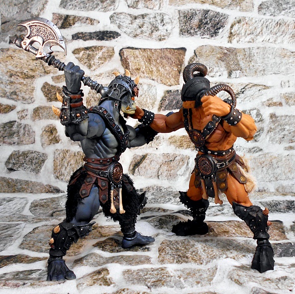 Argemedes mixes things up a bit in that he is a Cyclops! Perhaps, he’s a smaller, distant cousin of the larger mono-eyed Brontus, The Arena Troll from The Coliseum Wave. Mythic Legions is a line that is built around mixing, matching, and repainting parts, and while it manages to achieve a pretty good amount of diversity, I think the parts sharing is probably most obvious in these Ogres sized figures. I’m not knocking them for it, but I just find it a lot more noticeable here if you gather them all together. If you stand Argemedes next to Kkurzog, you can see there are more differences in the paint scheme than the actual sculpt. They share the exact same bodies, hands, and feet, as well as the same wrist bracers. chest harnesses, and leg armor. The belts are nearly identical too, with only the disc in the center being different. Argemedes also has a much thicker and larger barbarian diaper to hide his trouser cyclops.