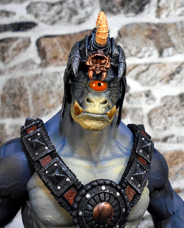 Argemedes does have a brand new head, which makes him and his one big eye rather unique. The lower structure of his face is still very Ogre like, with the flat nose, broad mouth and prominent tusks. Maybe one of the Ogres got busy with Brontus and Argemedes was the result! He’s got craggy skin around his single blood-orange eyeball. The paintwork on the head is excellent, with some nice shading and the skin changing from blue to a creamy yellow around his nose and lower jaw. I also really dig the paint and sculpt that went into those tusks.