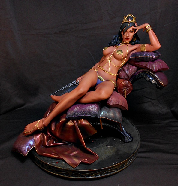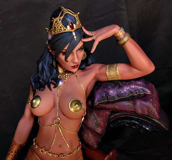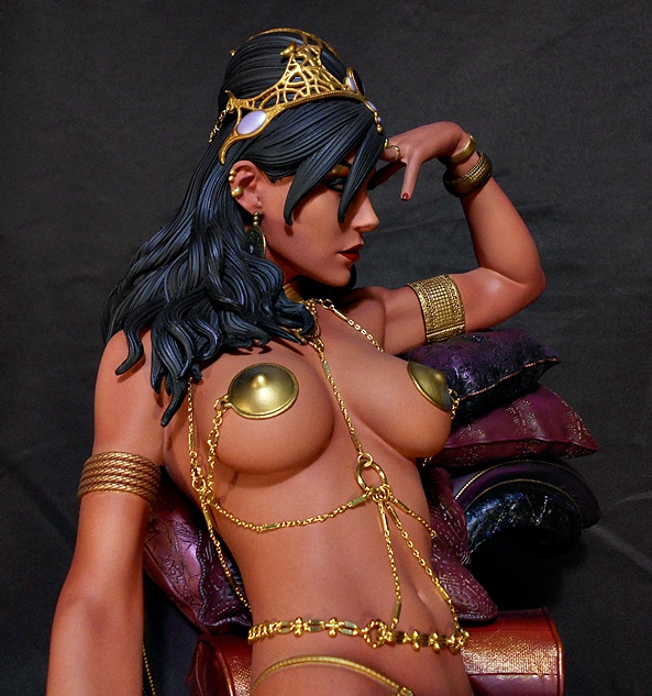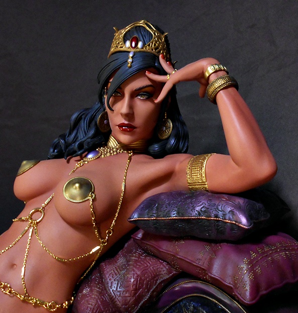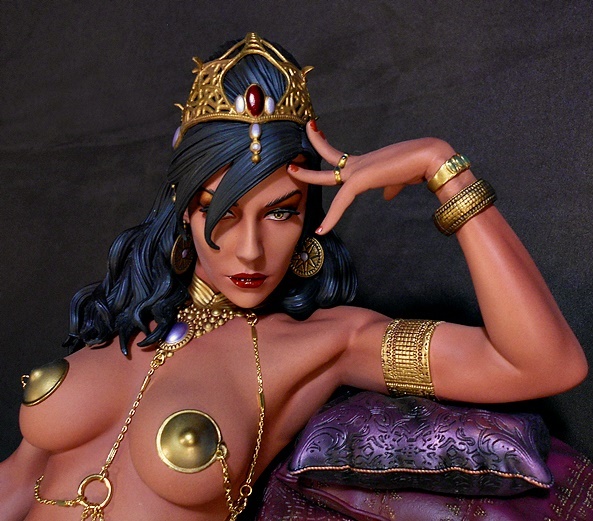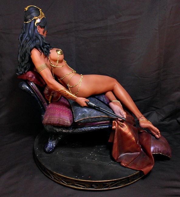 When it comes to her outfit, there’s not a lot of it. As a result, a great deal of Dejah’s figure is just reddish-brown skin conveyed though a spectacularly soft and even paint job. She wears a veritable web of gold chains, which connect to a waist chain and two golden cups to cover her nips. Some of this, like the waist chain, is sculpted onto the statue, while some of it is actual chain, giving it some great depth and realism. Her rather elaborate necklace features a purple stone dead center, she has a rather wide wrist bracer on her right hand, smaller bangles on her left, bicep cuffs on both arms, and various ring fingers. All fo the jewelry is painted with a sumptuous gold leaf paint. Down below she sports a rather skimpy G-string, secured with a mix of gold chain and pearls, she has several anklets, and even some toe rings.
