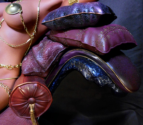 The base consists of a very thick and heavy disk, the surface of which is carved with a map of Barsoom with studs representing each of the Martian Cities. The chaise lounge locks into it with keyholes and remains very sturdy. Some amazing detail has gone into the individual pillows that Dejah reclines on. You get some ornate Eastern patterns, some gilt decorations, and plenty of tassels. It can’t be easy to make polystone look like soft and inviting cushions, but they sure got the job done here!