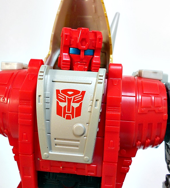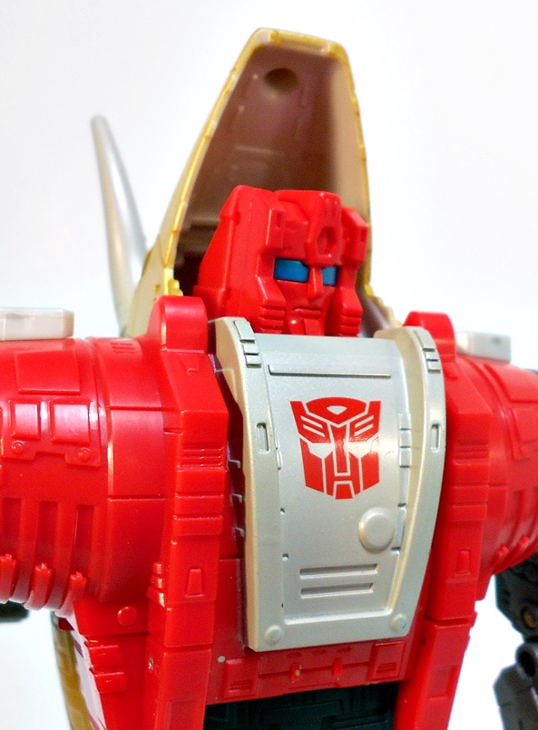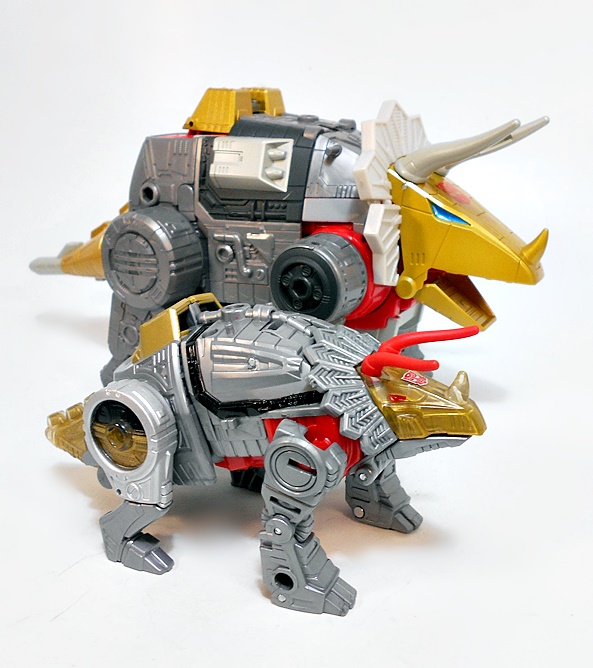 The portrait is nicely done as well, with a sharp sculpt. It’s worth mentioning here that I love the red plastic used for the head and chest. It’s so bright and vibrant. It also contrasts beautifully with those big blue eyes. The chest piece is obviously faked out, as it’s not really the lower jaw of the dino head, but I think that was the right way to go here and it looks great.