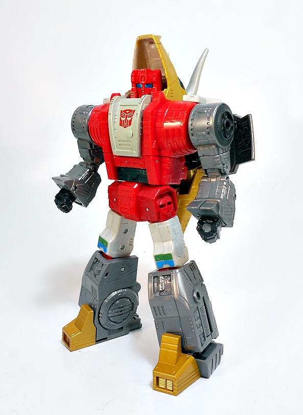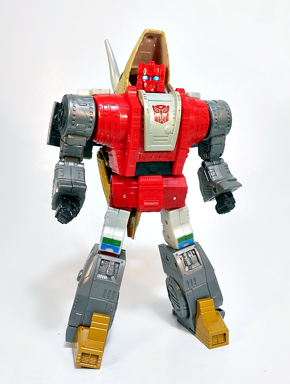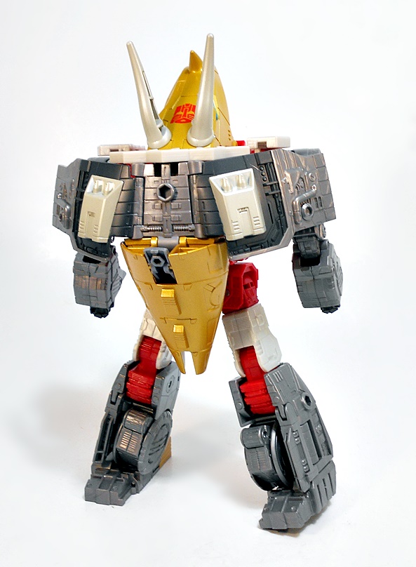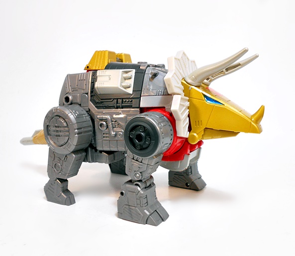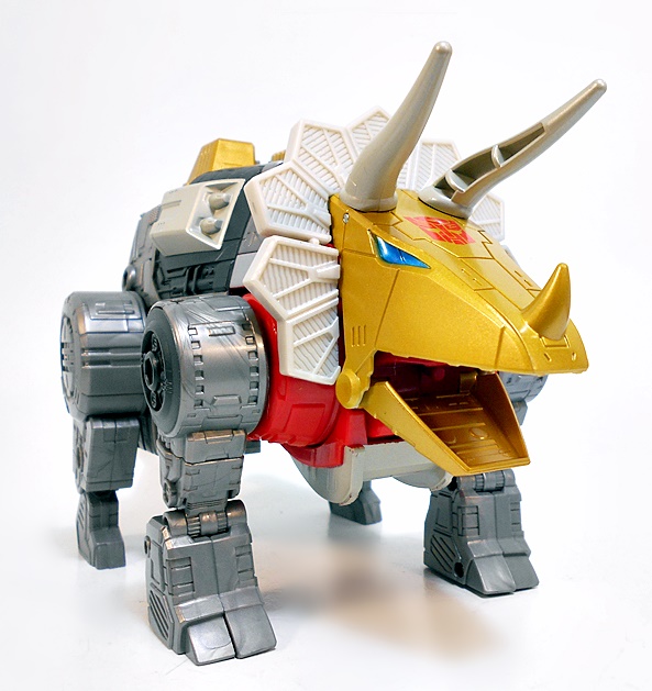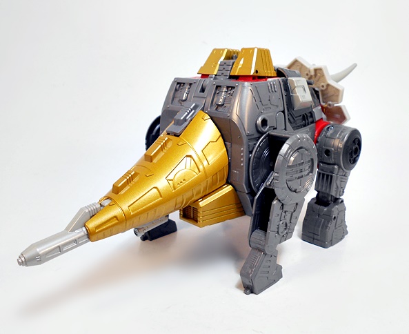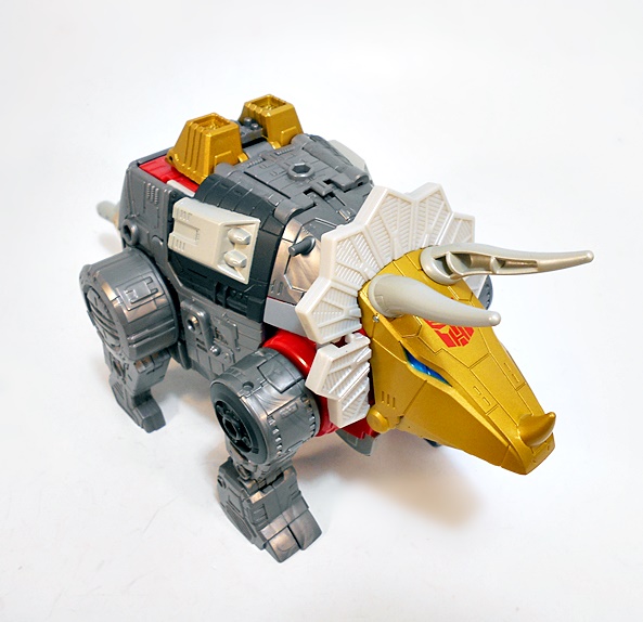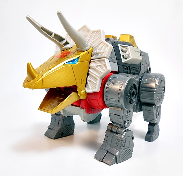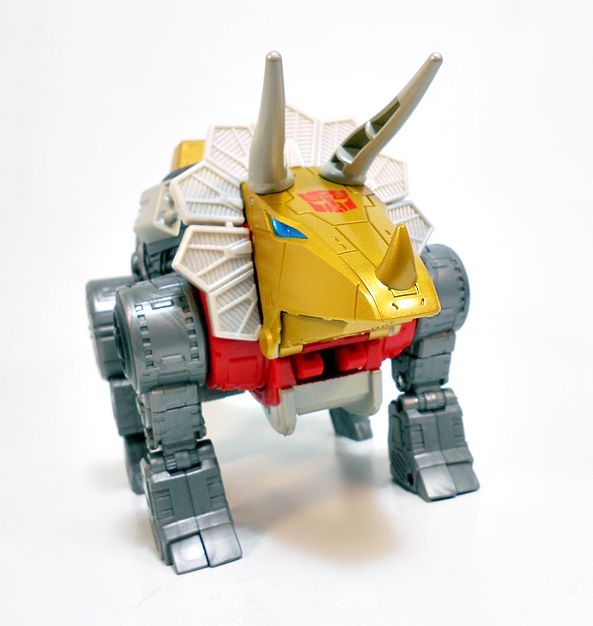 The head has a nice satiny gold finish, which is repeated for the back ridges and tail, and the blue eyes are quite striking. He’s got white plastic horns protruding from the top of his head and a smaller upturned horn jutting up from his nose. The crest that frames his head is also left bare white plastic, which I’ll confess looks a little cheap, but I suppose it does match the coloring in the cartoon appearance. There’s no articulation in the neck, but the jaw does open, so that’s cool!