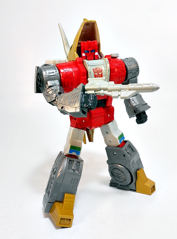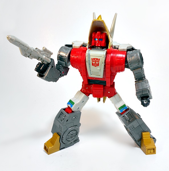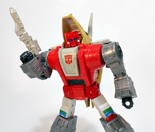 Like Grimlock, Slag comes with a gun but no sword. Yeah, that sucks. The gun is a decent sculpt, but I wish it was cast in black plastic instead of the white. And while on the subject, I really would have loved to get an homage to the missile launcher that came with the original figure. Where did all the plastic they saved from not including a sword or missile launcher go?