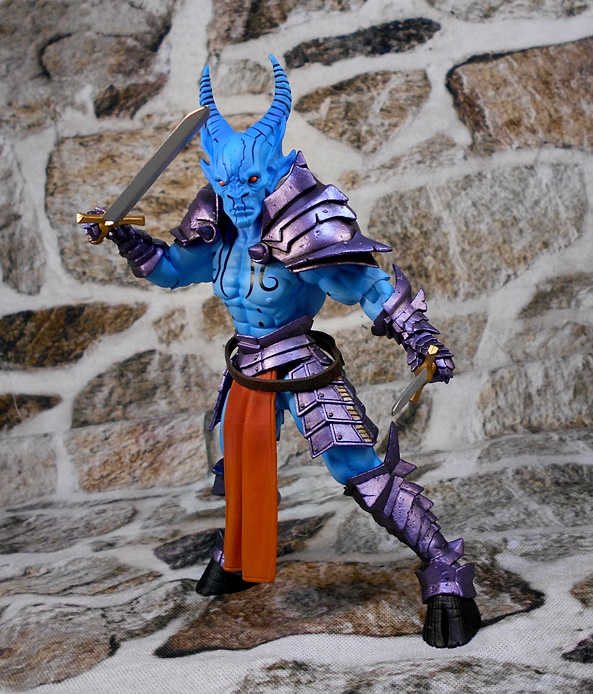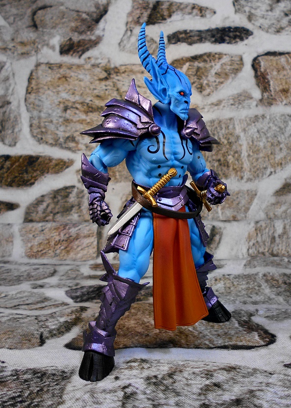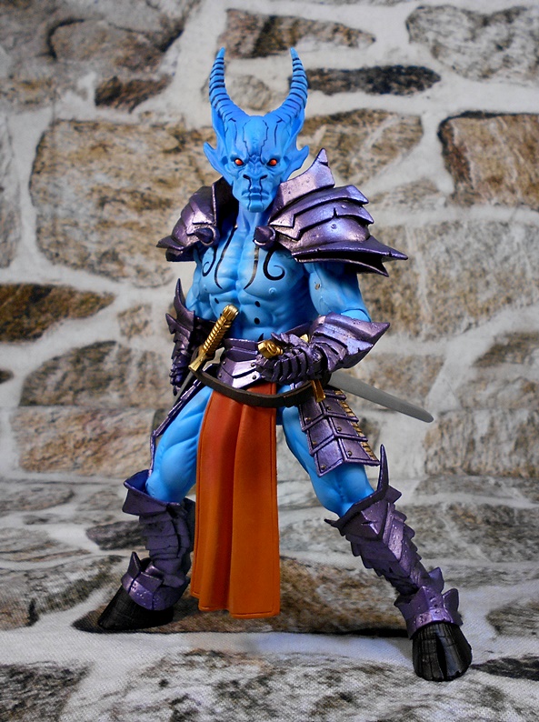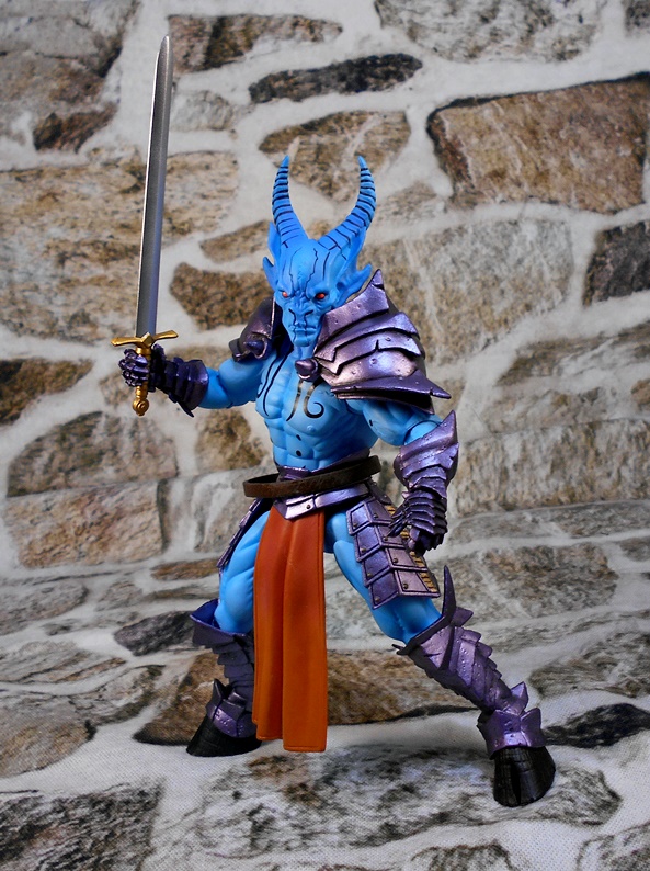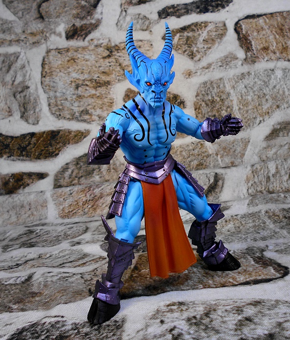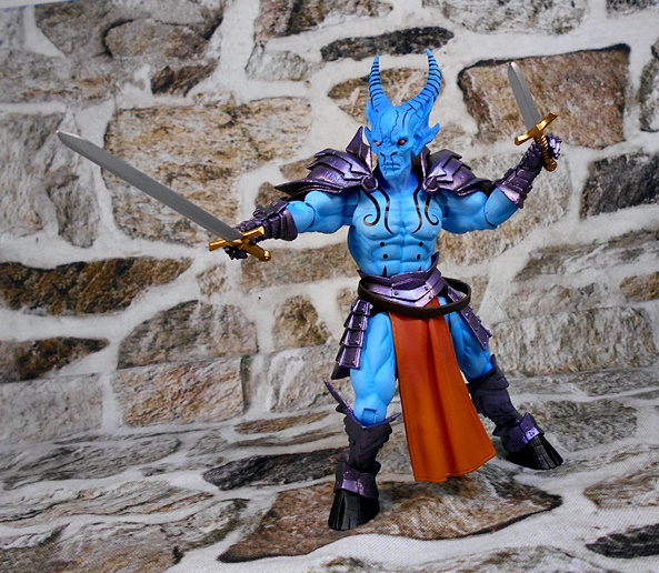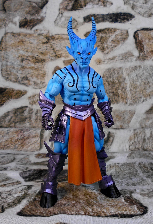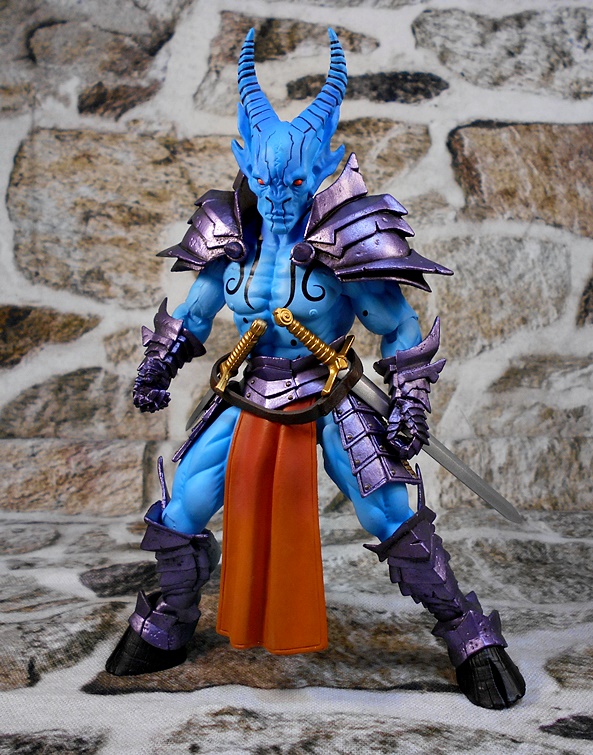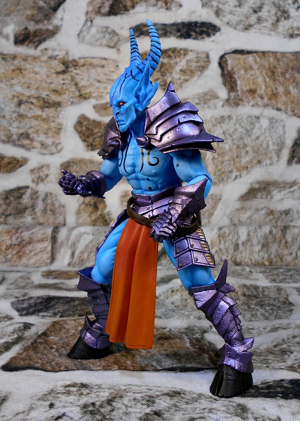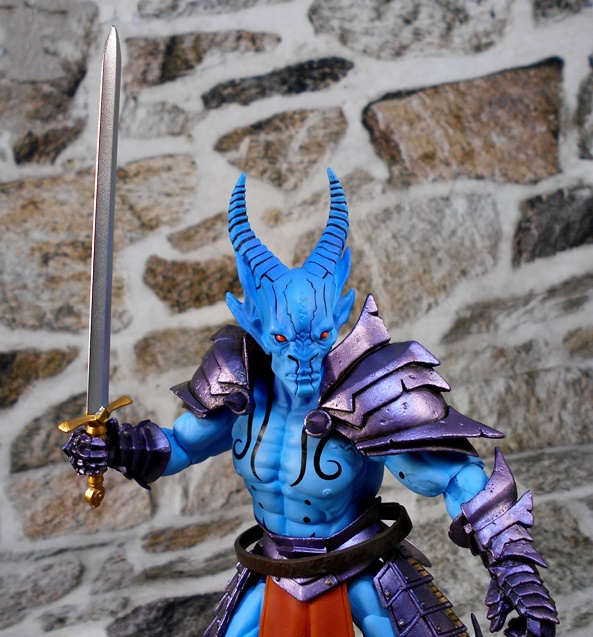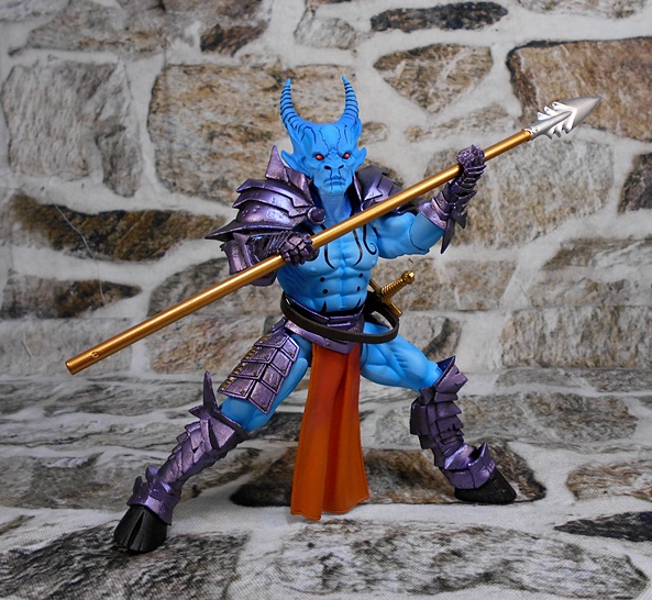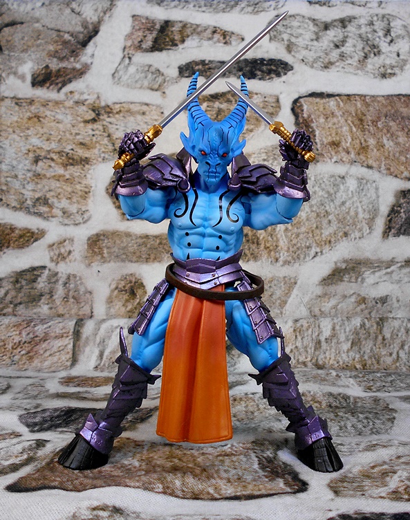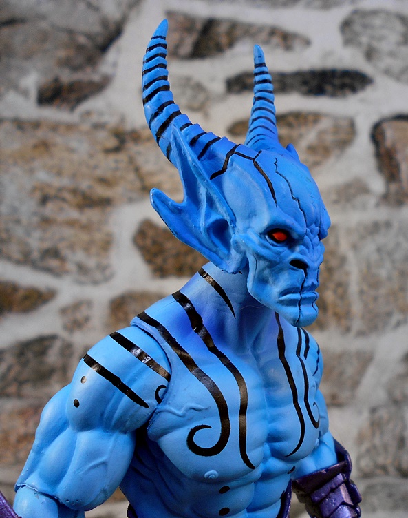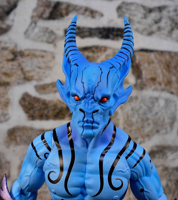 From the neck down, Zazhar is almost a straight repaint of Belphegorr, the last Demon I looked at from this line. He’s got the same gauntlets and leg armor, the same belt and hip armor, and the same hooves. The only difference is TFH swapped out the furry-style loin cloth for this orange sash, which makes for a cleaner, simpler look. The armor pieces are all painted with a gorgeous metallic purple finish, which makes that pitted and nicked armor look a lot snappier. It also makes them look like they may be enchanted! Zazhar’s vibrant blue skin is beautifully painted, with some nice variations in tone and shading. I find this a lot more appealing than the yellow they used for his brother. You also get a slew of tattoo tendrils on his shoulders and snaking their way down his chest, along with some dots on his abs and arms. It makes for a tribal look that gives his demon bod lots of personality.