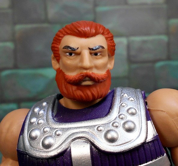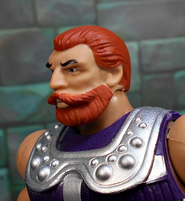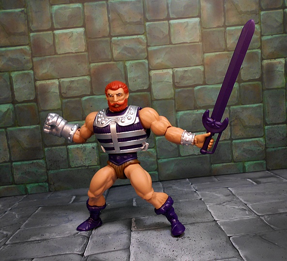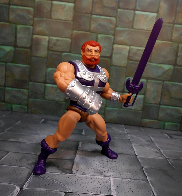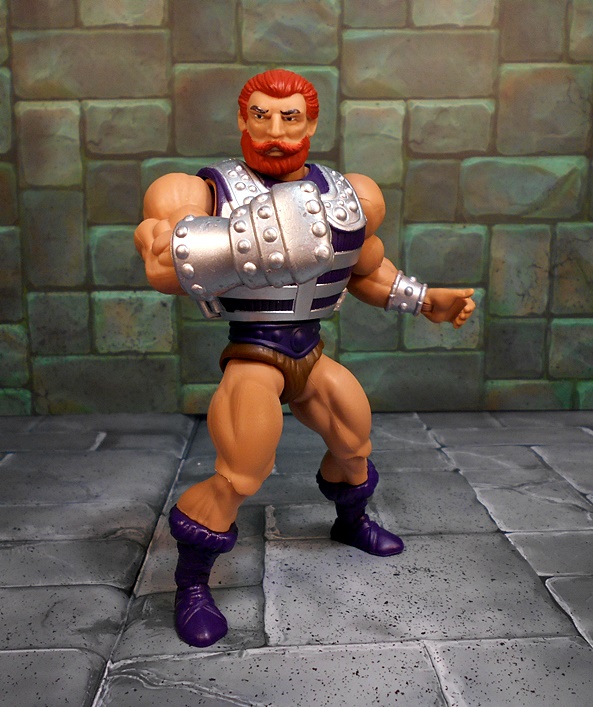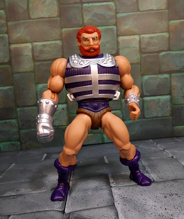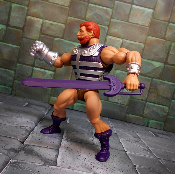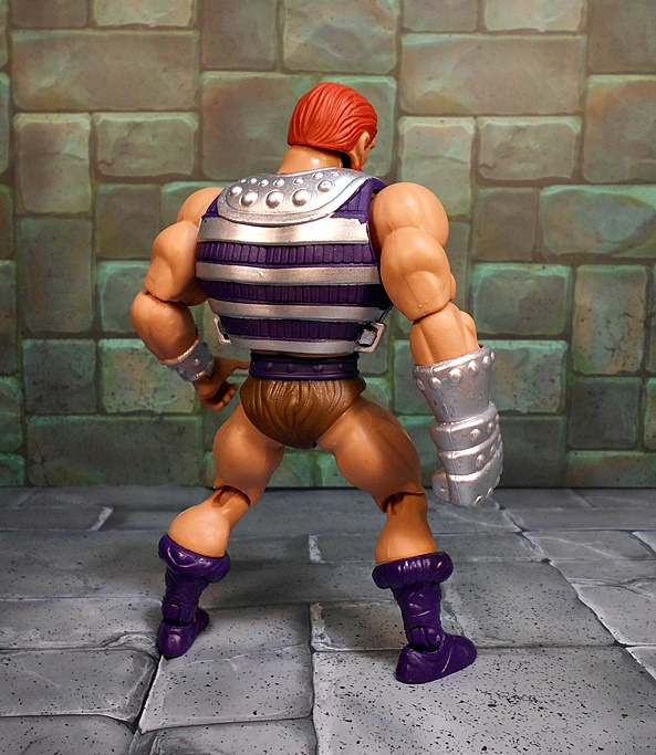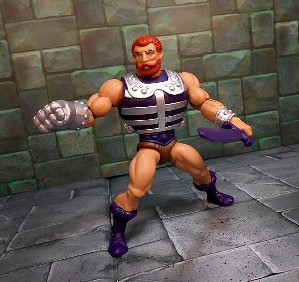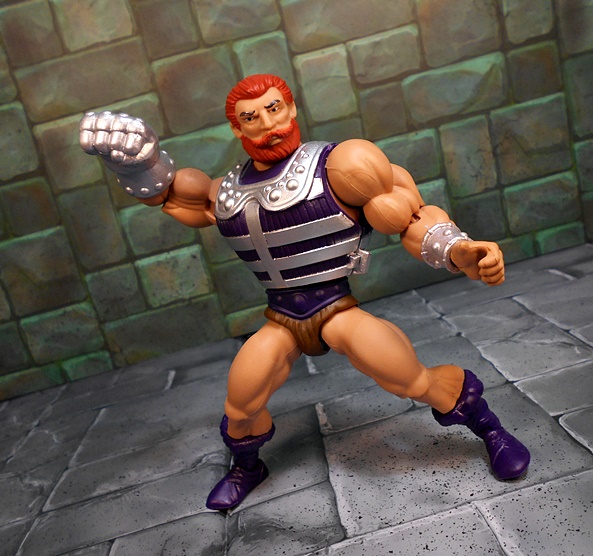 Moving on to Fisto, and compared to Roboto, we’ve got a dude that looks pretty normal, at least according to the Eternia Scale of Normalcy. Fisto borrows a lot from the standard He-Man buck, complete with purple boots and belt, and the ubiquitous furry barbarian diaper. His torso is wrapped in a purple and silver vest, which makes him look a bit bulkier than most of these figures, but it works! He’s got a silver wrist bracer on his left arm and his right arm is equipped with the reason for the season… A GIANT METALIC FIST!!!