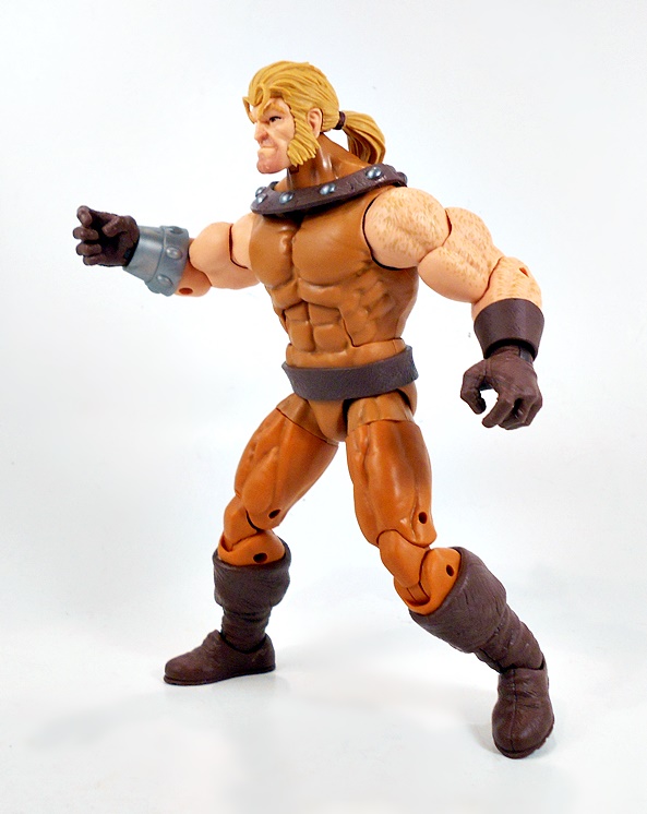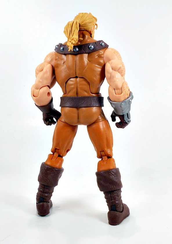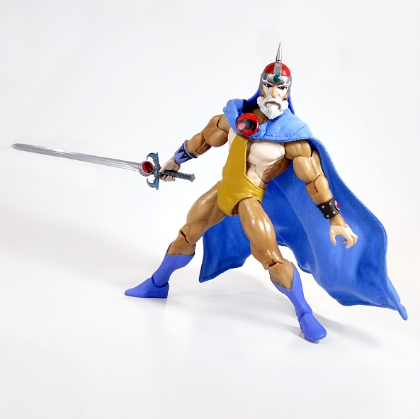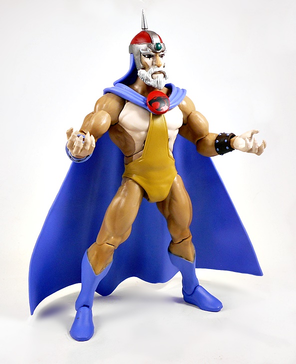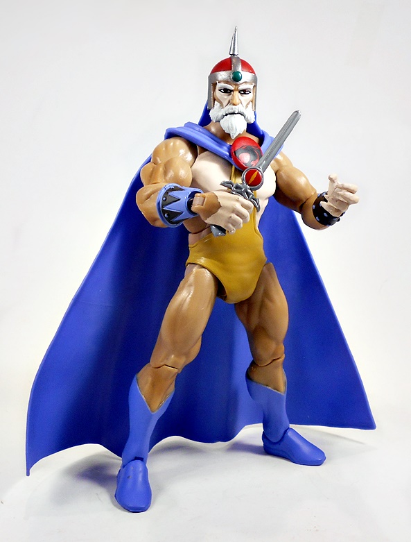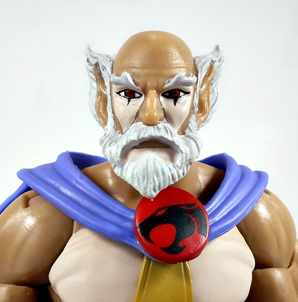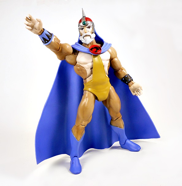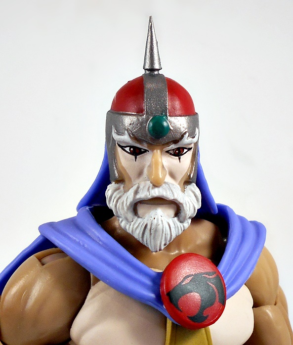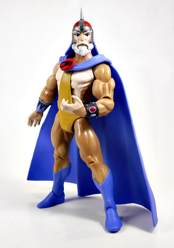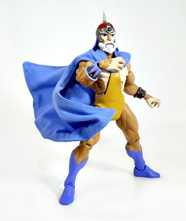 Here’s Jaga out of the box and looking like he stepped right out of the screen into my living room and making me spit out my Fruit Loops. Super7 has been doing a great job nailing the simple animated styles on these figures, and Jaga is another fine example of that. His body is brown and off-white, with some bright blue boots, a pair of mismatched wrist bracers, and an unusual gold belt-undie combo, which reaches up to his neck and clips onto his blue cape, just under the bold ThunderCats emblem. And Jaga is looking pretty good for an old cat, as he’s positively ripped with muscles! The cape is plastic, but you get a bonus soft-goods cape, which we’ll check out at the end. Some of the paint lines could have been a little sharper on my figure, mostly where the brown and off-white patterns of his body meet. There’s nothing outrageously sloppy, but at the same time, there’s room for improvement.
