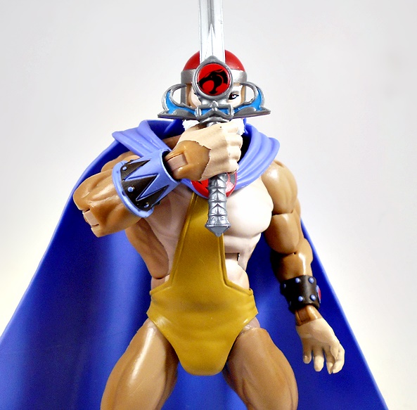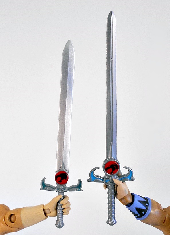 I have yet to receive my Super7 Ultimates Lion-O, so currently, I only have the sword that came with the original Matty Lion-O to compare this one to, and it is a completely new and vastly improved sculpt. The hilt is bigger and has sharper detail, as well as a much more pronounced and better painted Eye of Thundera. I also like how the cross-guard is curled in a little more to give you that proper Sight-Beyond-Sight configuration. The blade is longer, and has a central fuller instead of a diamond cross-section. The only thing I prefer about the Matty version is the silver paint on the blade, which I think looks a bit nicer.