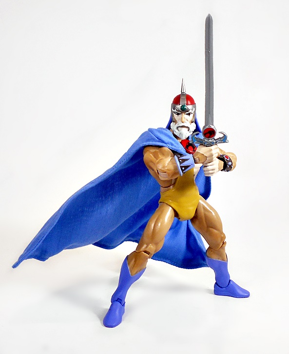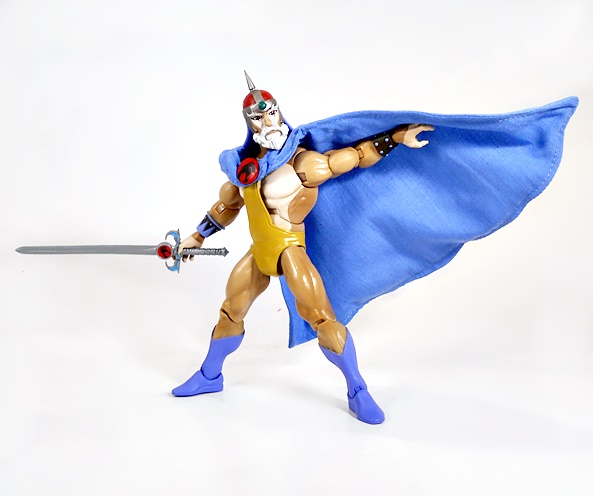 Our last stop in the review is the soft-goods cape, which actually comes on the figure in the package. Both capes have pegs behind the ThunderCats emblem that plugs into the top of Jaga’s outfit. It works OK, but I would have appreciated a pet hole in the chest too, so it would anchor it down better. As it is, the peg can press against the figure’s chest and pop out, although it doesn’t happen all that frequently. The soft cape is beautifully tailored with some immaculate stitching and a pretty close match for the blue plastic used for the boots. It also has a wire to assist with some dynamic poses.