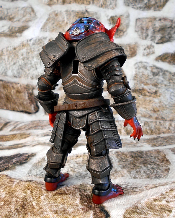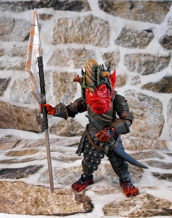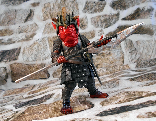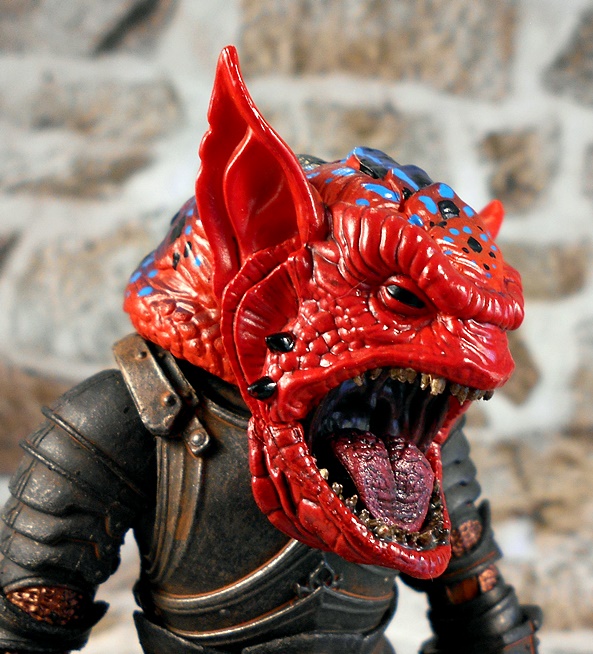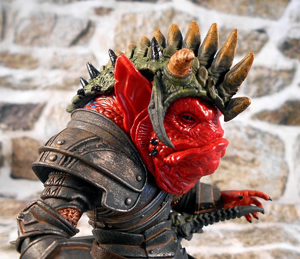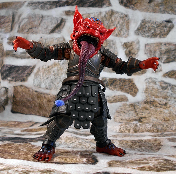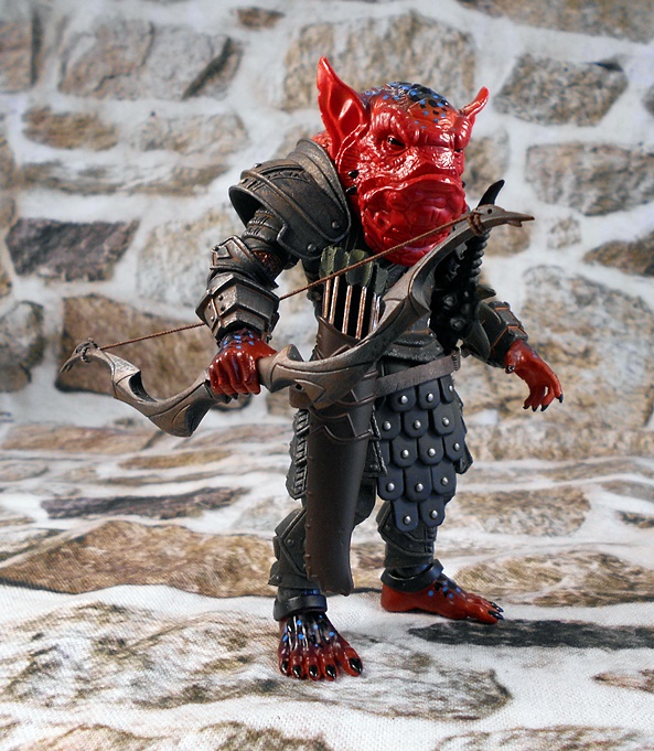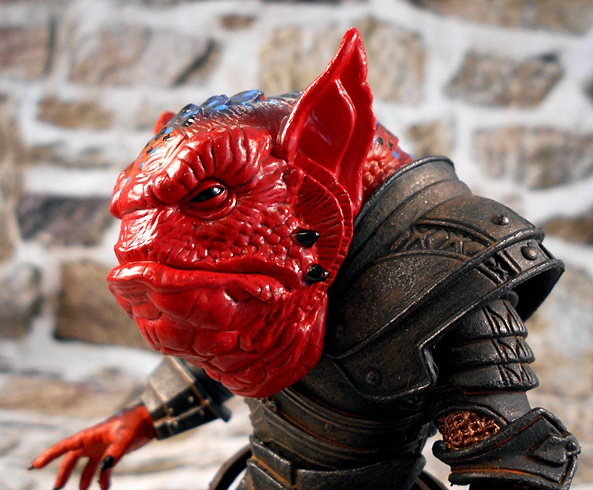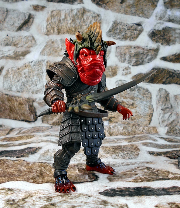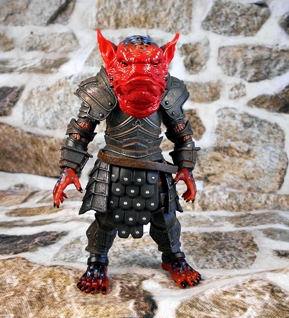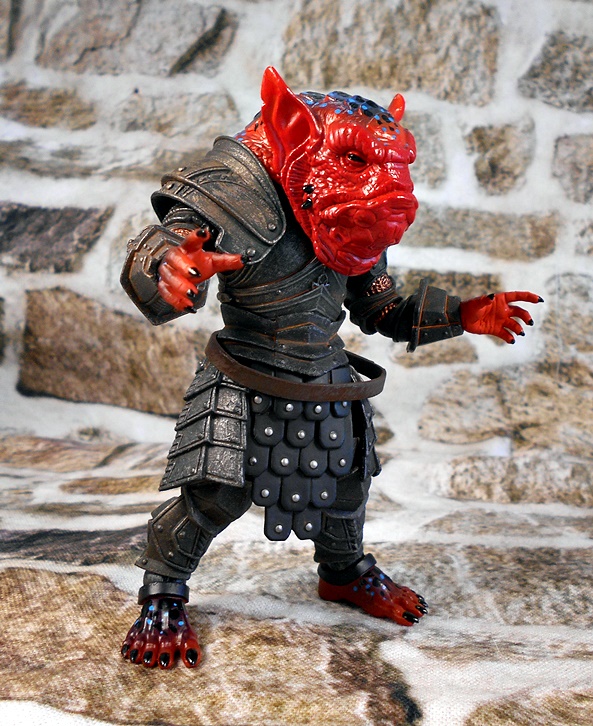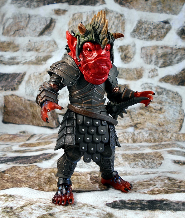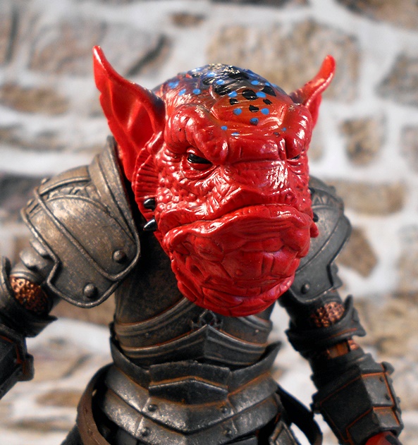 And what a glorious head it is! I believe this is a straight repaint of the Bog Goblin and is a work of grotesque art. The broad fish-lipped mouth, the pointed ears, the thick coil of brow over those beady black eyes. It’s all so good! I can practically see his neck filling with air as he breathes. You also get some little black horns protruding from the sides of his jowels, and some black and blue speckling at the top of his face. The crimson paint is so beautiful, and it’s given a healthy dose of gloss to make him look extra slimy and disgusting… I mean beautiful!!! The rather unconventional head design features two pieces: The back that joints into the neck peg, and a giant face that pegs into the front of that, giving him the ability to tilt his head left or right. It also gives the ability to swap faces…