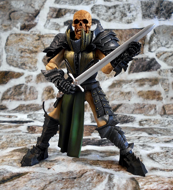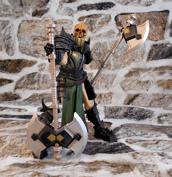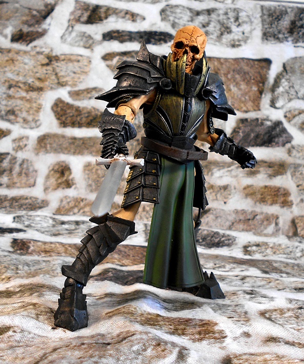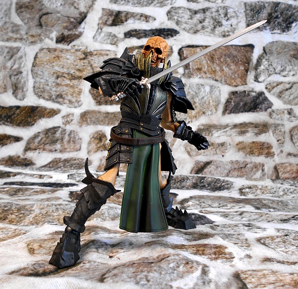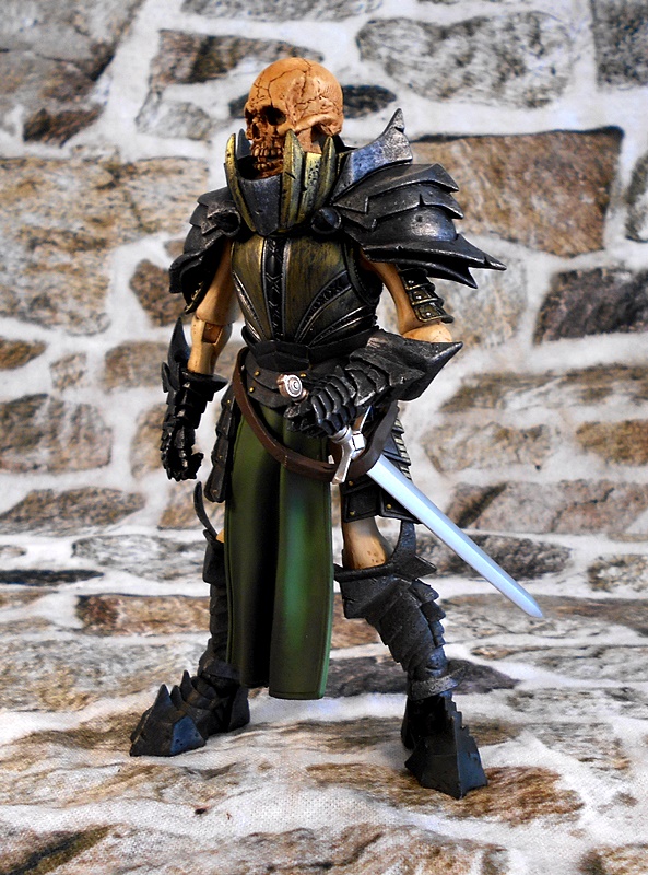 One of the two sons of Necronominus, he is billed as a devout enforcer of his father’s teachings. Because this figure comes from the original batch, there’s nothing here that we haven’t seen before many times over. But, that doesn’t make him any less great. Malleus’ armor is a combination of the knightly torso, belt, sash, and hip pieces and the more crude Orc shoulders, collar, gauntlets, boots, and lower leg armor. The upper portions of his skeletal limbs are exposed to show off that he is indeed a boney fellow. The knightly pieces of armor are given a green wash, perhaps suggesting an original brilliant emerald color that has long faded, along with the green sash to match, and brass painted rivets. Meanwhile, the Orc pieces are presented in their usual black iron finish with all those lovely nicks and pitting in the sculpt. I really love this combination, as it gives him a battle-ready ruggedness with a hint of style to make him stand out as a noteworthy warrior.