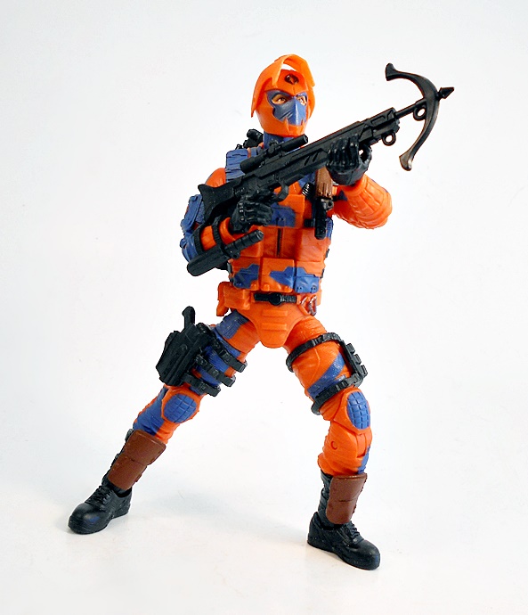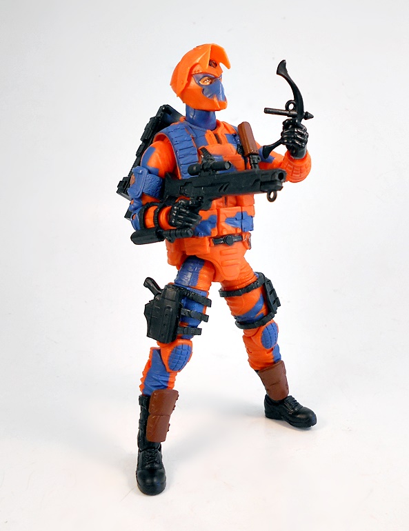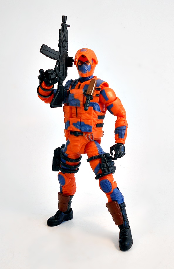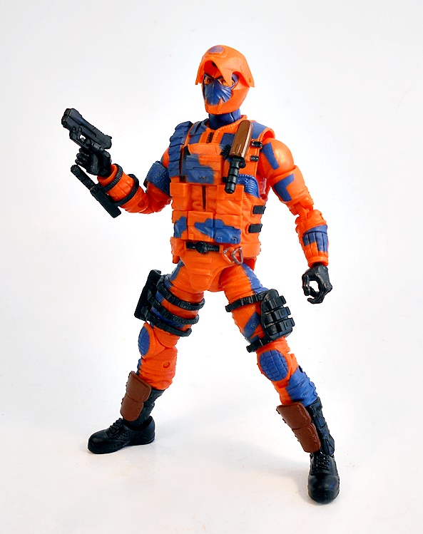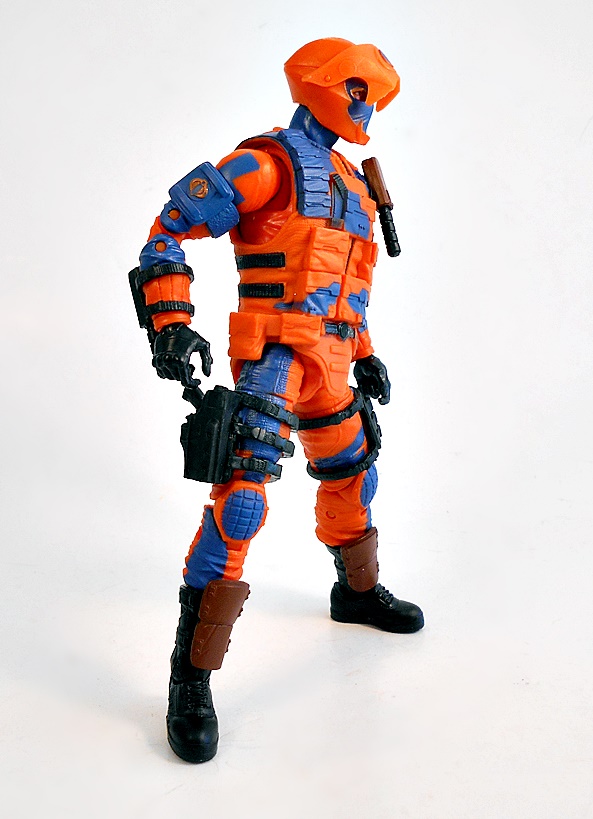 Out of the package, it’s hard to first notice anything but the colors… Oh, the colors! The Alley Viper fatigues consists of an retina-sizzling orange and blue camo, with some black and brown thrown in just to keep things somewhat grounded. Love it or hate it, GI JOE Series Eight was knocking on the 1990’s door, ushering in an age of obnoxious toy colors. The Alley Vipers were billed as being brave, and let’s face it, you’d have to be to go into battle wearing this! Once we’re past the deco, I have to admire the attention to detail that went into the fatigues and gear. His vest is a veritable slab of pouches, which extends to his right shoulder. He’s got more pouches on his belt, sheathes for his knives on his right forearm and left shoulder, and a holster for his pistol on his right thigh. And then there’s that gorgeous blue shoulder pouch with the orange Cobra insignia! It’s a lot to take in all at once, and before you can process it all, he’s probably already killed you.