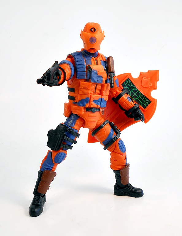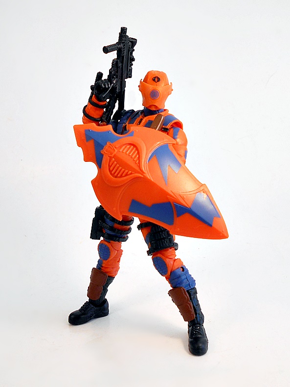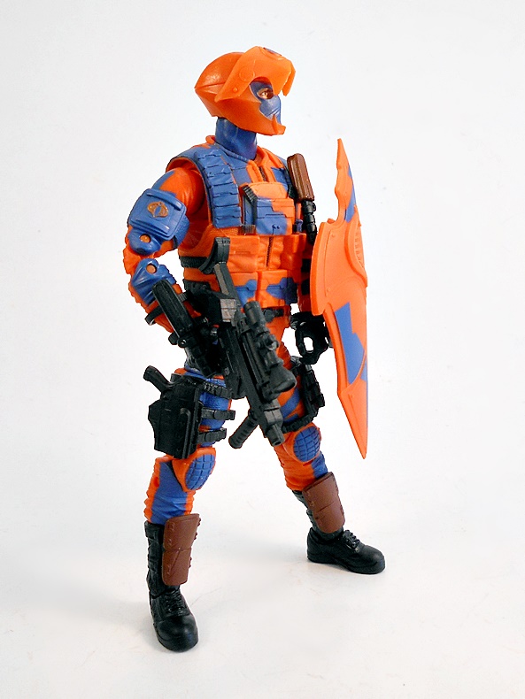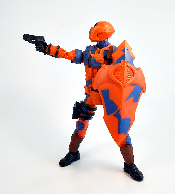 I’ve saved the Alley Viper’s most iconic piece of kit for last, and that’s his riot shield, and boy is it a beauty. This defensive shield shares the same orange and blue deco as the Viper’s fatigues, and has a bold and beautiful Cobra emblem sculpted into the top center. It attaches to the figure’s arm with a pair of straps, and even has a pivot, so it can be positioned in a variety of ways independent of how the figure is posed. It also has a sticker on the interior side, which I presume is a viewscreen, so the Viper can still see what’s happening when taking cover behind it. A lot more safe and secure than the slits in conventional riot shields!