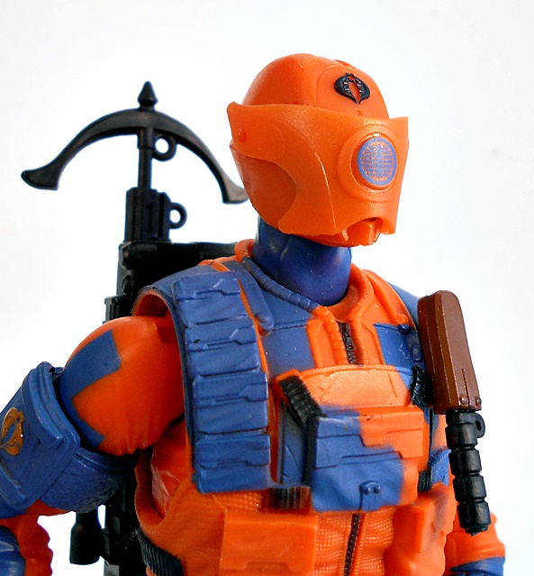 The Alley Viper’s head is encased in a form-fitting, open-faced helmet. with snake fangs emerging from the chin guard, and a textured blue mask beneath it, showing only his determined and hate-filled eyes. There’s a hinged visor, which can be lowered to shield his face, and has only a circular screen in the center for detail. I presume this is some type of imaging sensor that allows him to see, but it sure makes him look creepy and inhuman. The black embossed Cobra emblem at the forehead is a nice touch as well!