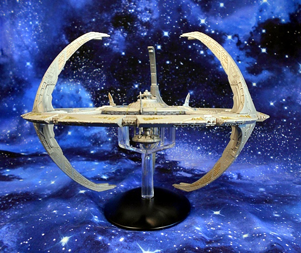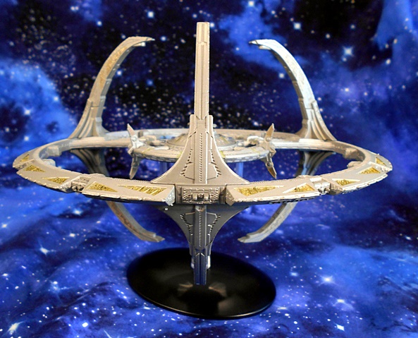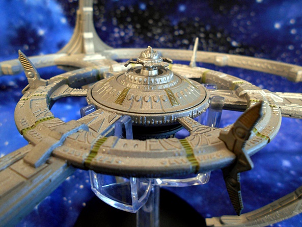 And here’s DS9 all set up, and it’s amazing to me just how iconic this old Cardassian station has become to me. One look, and I can’t help but hear the melancholy, yet slightly triumphant, theme song swell up in my ears. And I can imagine a tiny Chief O’Brian running around inside trying to hold the thing together. The show creators took a lot of risks, not only setting this series on a space station rather than a starship, but on an alien station, stripping the show of almost any Federation comfort and familiarity. It sure was a gamble, and it paid off in spades. This old station saw some unprecedented growth for the Trek franchise, and showed us a new side of the Trek Universe, which TNG could only hint at. Suffice it to say, I absolutely love the design of Terok Nor, with it’s inhospitable arching tendrils, concentric circles, and jagged edges. It looks like some kind of bizarre sea creature floating in space. And boy, did Eaglemoss do a great job bringing that design to this model!