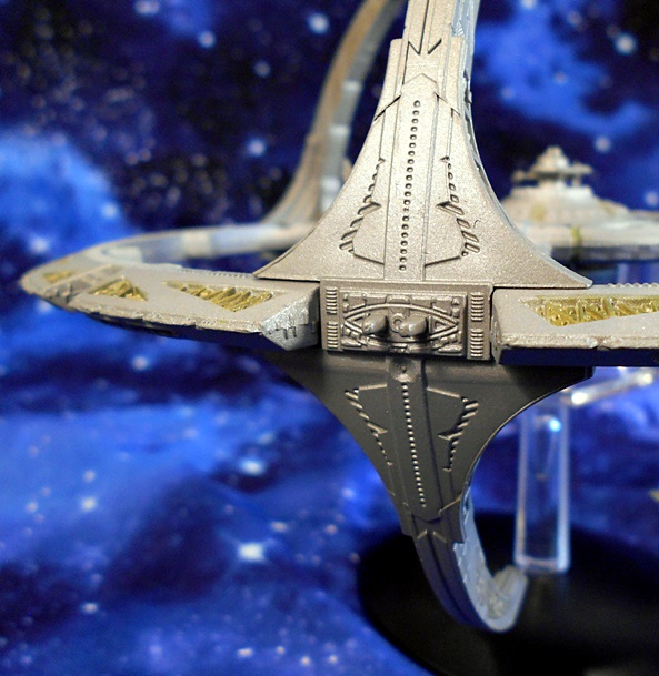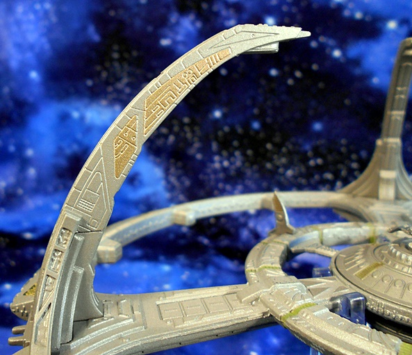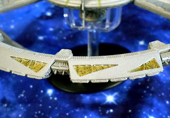 The mix of diecast metal and plastic gives the model a nice heft, while still allowing for some very sharp detail. Each of the tiny docking ports are present around the outer ring, you get the tiny hatches on the inner towers, signifying the hidden location of the torpedo launchers, and some really nice sculpting around the inner habitat ring. I think my favorite details on the whole model are the painted triangular cut-outs that show some more intricate details inside.