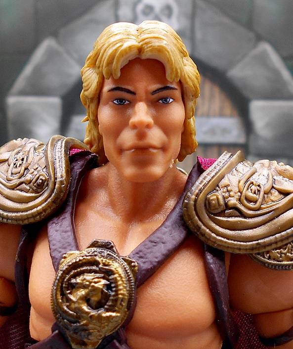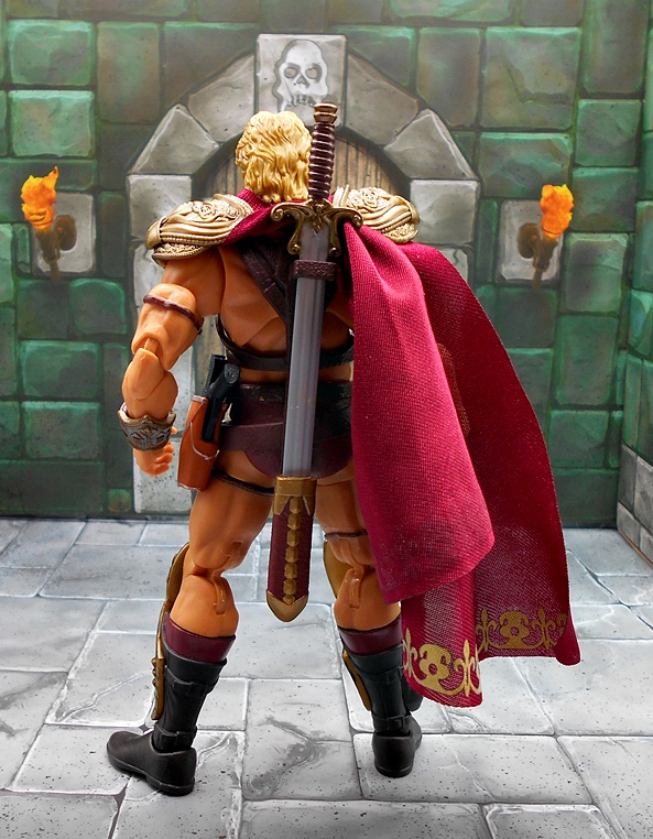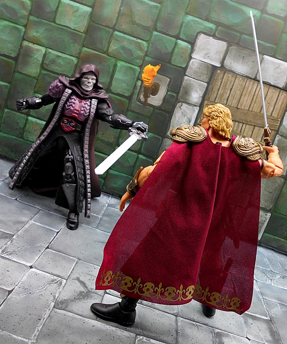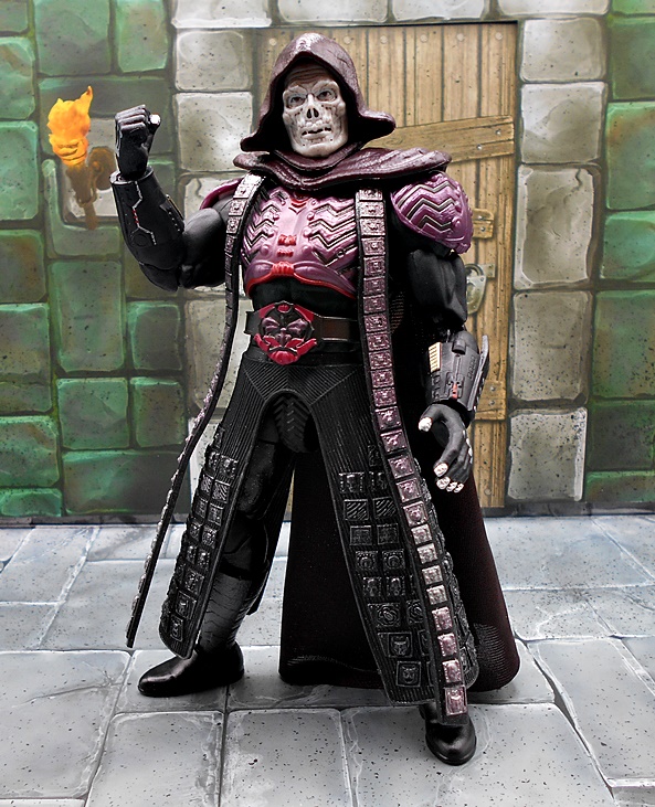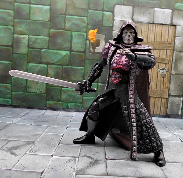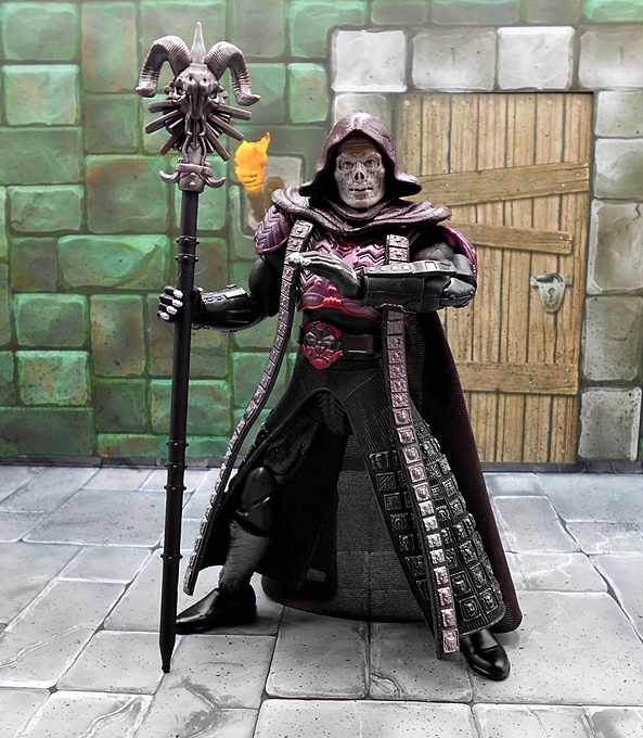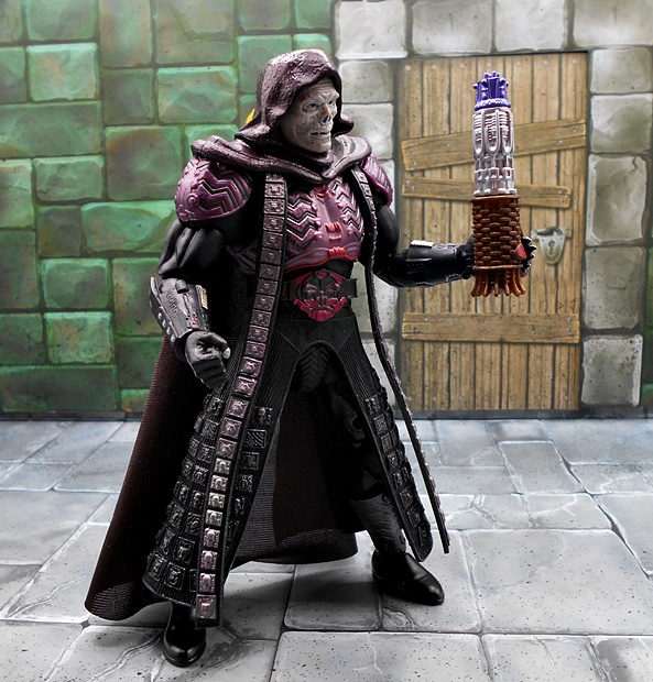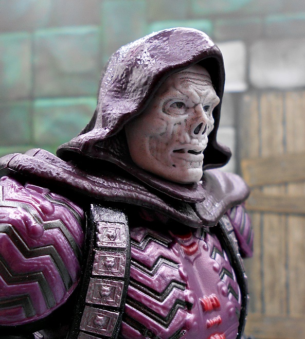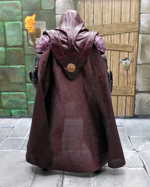 As much as I loved He-Man’s redesign for this film, I think I dig Skeletor’s even more! It’s an even bigger departure from the classic design, but it looked great on the big screen and it looks pretty damn good as an action figure too. There’s a lot of layering here, with the partial skirt being cast in plastic, as well as the two strips of plates that run from his shoulders to his ankles. You get some beautifully sculpted armor on his chest and shoulders, which I can only describe as having an organic techno-skeleton vibe to them. The metallic purple paint used for these pieces is really snappy too! The lower skirt also has a series of square plates sculpted onto it, resembling brigandine style armor. Skeletor has some really cool bracers, and I dig the silver paint on the backs of his gauntlets that reminds me of a circuit pattern. It’s a bit more pronounced here than on the actual costume, but that’s fine. The cape is light cloth with a triangular plastic piece jutting down, probably intended to be leather, and punctuated with a single bronze painted medallion. The layering and textures of the costume combined with the ornate sculpting makes for an awesome looking figure.