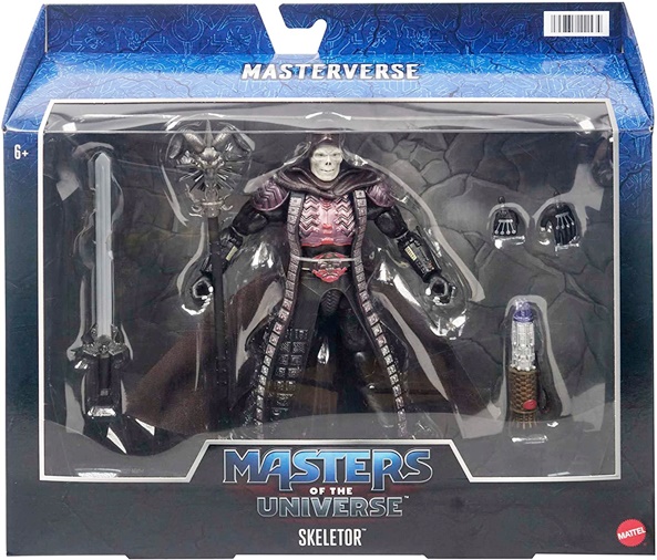 Last week I checked out He-Man based on the 1987 film from the Masterverse series, so it’s only fitting I swing back around and have a look at his nemesis Skeletor. Mattel did a few figures from the movie as part of their Classics line, but sadly the line came to a close before they could get to those versions of He-Man and Skeletor. Super7 stepped in to release them, but now Mattel has finally served up these versions as regular retail release action figures. Skeletor had two distinct looks in the movie, regular and golden God all hopped up on power. This is the former version. Super7 did both, and I sure am hoping that Mattel will too. But that’s getting ahead of myself. Let’s have a look at the packaging…