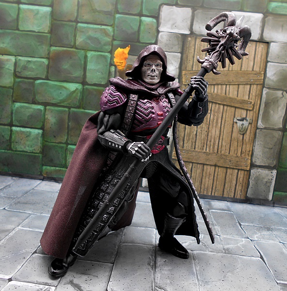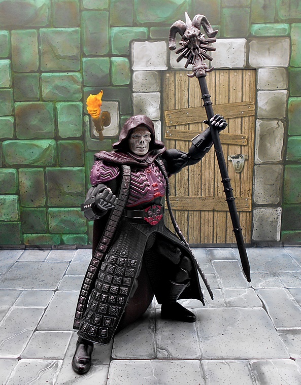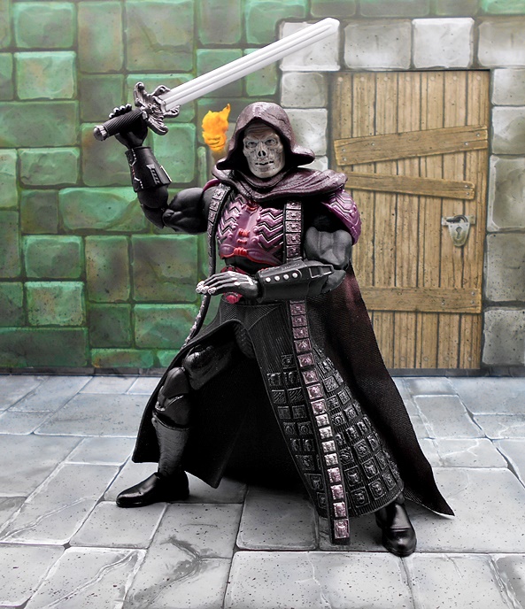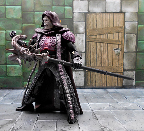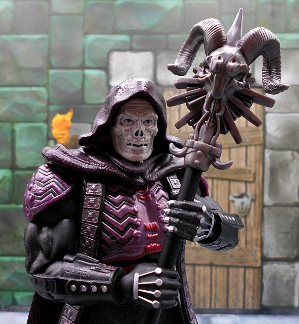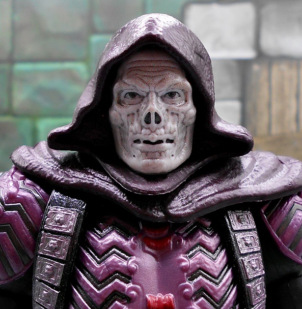 In terms of portrait, Skeletor fares a lot better than He-Man did. You only get the one head sculpt, but I guess Mattel’s thinking was if you get it right the first time, you don’t have to offer a second option. And wow did they get this right! The definition of the skull features mixed with what looks like lumps of malformed flesh makes for a sinister look and a downright superb bit of sculpting. The waxy gray coloring of the skin works too, although I sometimes wonder if a greenish tint would have been the way to go. The hood is sculpted in plastic as part of the head, which looks great, but does curtail his head articulation quite a bit. The rest of the articulation points seem to be identical to He-Man, but you do get a little more restriction in the hips because of the plastic skirt. It’s also worth noting that the shoulder pieces are designed to pop off if you exceed the range of movement up there.