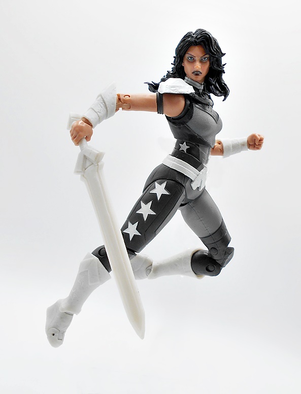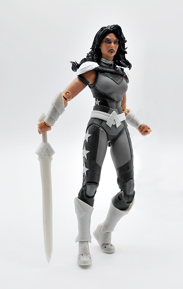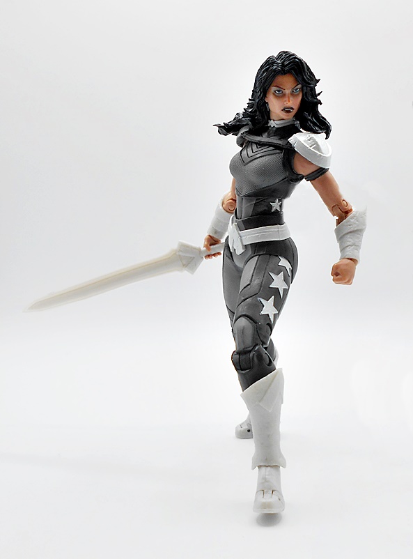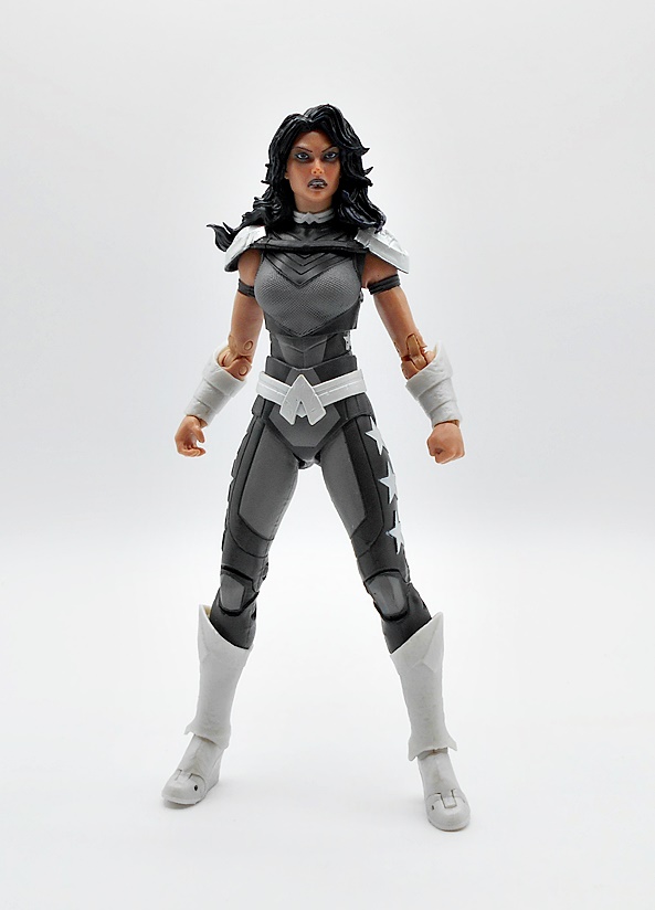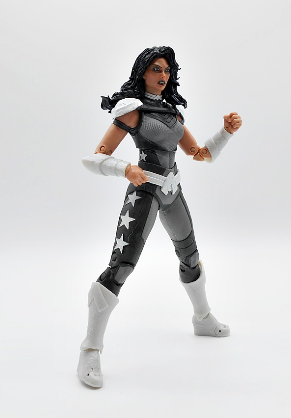 Unlike Nightwing, I do have a few Donna Troy/Wonder Girl figures in my collection, but it’s been a long while, so I’m happy to grab a new one, but my how she’s changed! Well, let’s start with the outfit, because it is excellent. Sure, it’s very monochrome and I prefer either a little more color, or her trippy starfield suit, but clearly the context we’re going for is grimdark and I still can’t help but love all the detail and work McFarlane put into this costume. The suit itself is a black and gray combo with the gray bits being very nicely textured and the darker areas having some clean panel lines. The boots, bracers, belt, and shoulders are all cast in a somewhat pearlescent plastic, which looks a lot less flat than I expected. You also get some similarly colored stars on the outsides of her thighs, adding a little pop and cheer. If I wasn’t a huge fan of this costume at first, the sculpt sold it to me after just a short while.